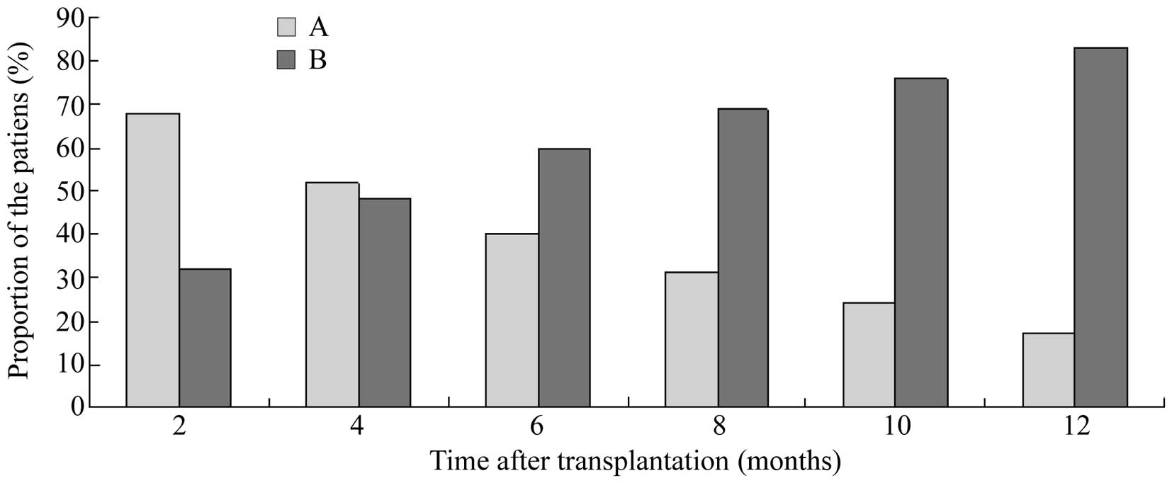 By the end of the follow-up, 1 patient succumbed due to Guillian-Barre syndrome at 3 months post-transplantation; at the time of death, the transplant was functioning with a plasma Cr of 127 µmol. In addition, 1 patient experienced graft loss from severe pulmonary infection; and one graft was lost from severe bleeding of the renal vein due to Mycosis pilorum infection, as mentioned above. Overall, 1-year patient and graft survival rates were 96.9 and 90.9%, respectively. Furthermore, when reduction of sCr to <177.0 µmol/l was regarded as normalization of the renal allograft, the results demonstrated that the proportion of patients with normalization of the renal allograft gradually increased as the time elapsed, as shown in Fig. 2.