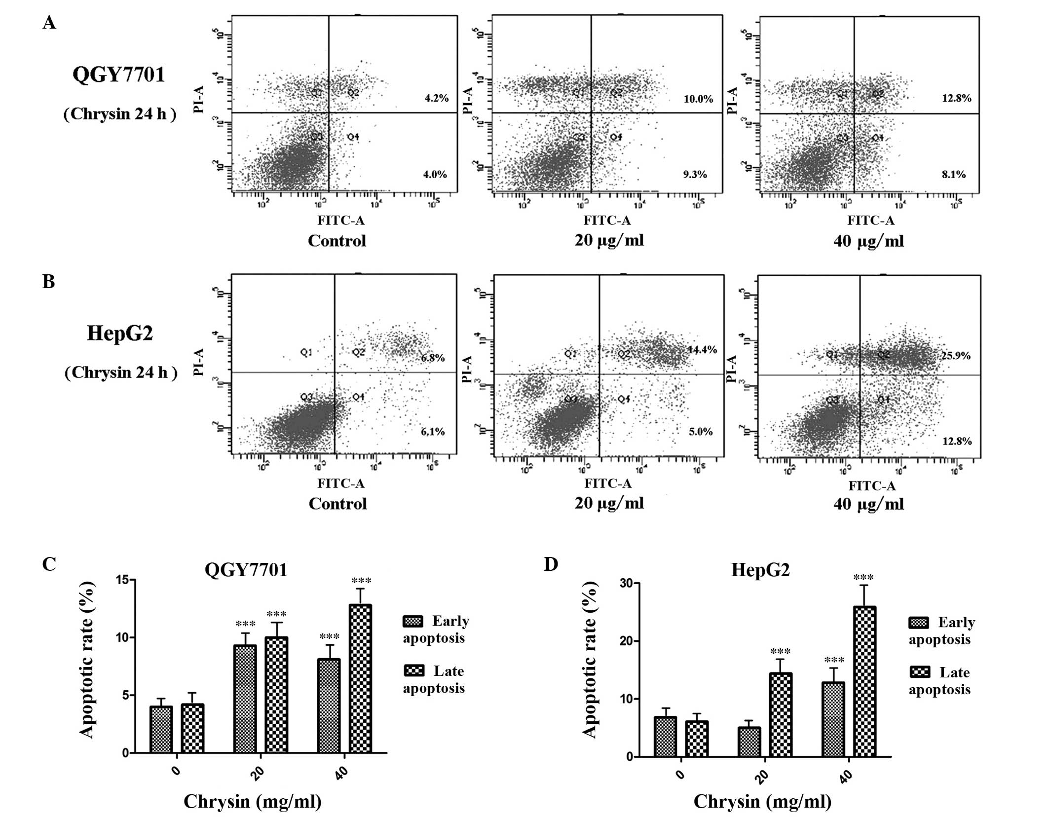 Therefore, the aim of the present study was to examine the anticancer effect of chrysin on HCC cells, and determine the underlying mechanism of chrysin-induced apoptosis in HepG2 and QGY7701 human HCC cells.