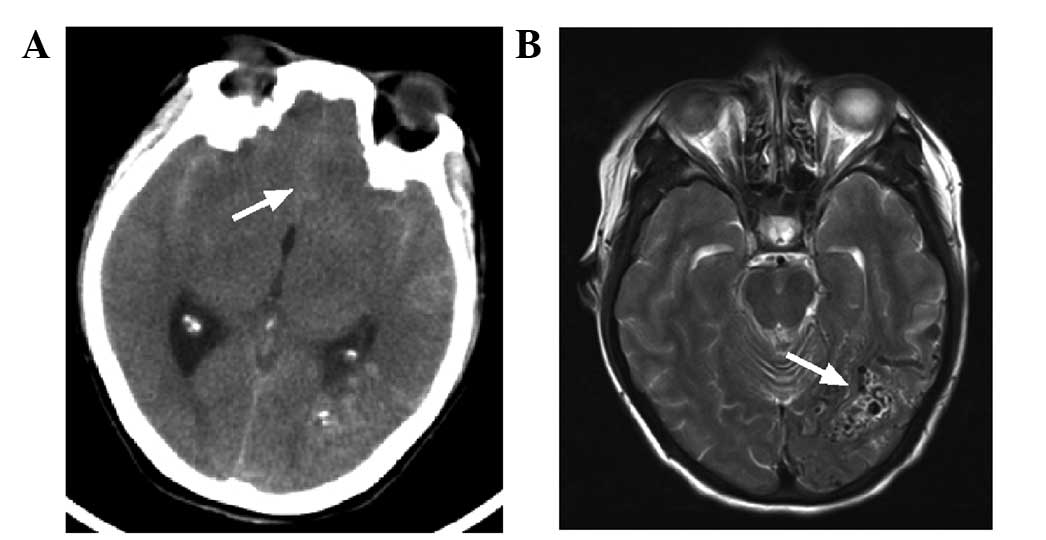 A 46-year old female patient was admitted to the First Hospital of Jilin University (Changchun, China) of 1st May 2014 due to a sudden and severe headache with nausea and vomiting. The patient was healthy, with no prior history of hypertension or diabetes. A physical examination revealed that the patient was conscious and able to answer questions accurately, and that her limbs were flexible with normal muscle tone, muscle strength grade V, a positive Kernig's sign, and a Hunt-Hess grade of III (5,6).