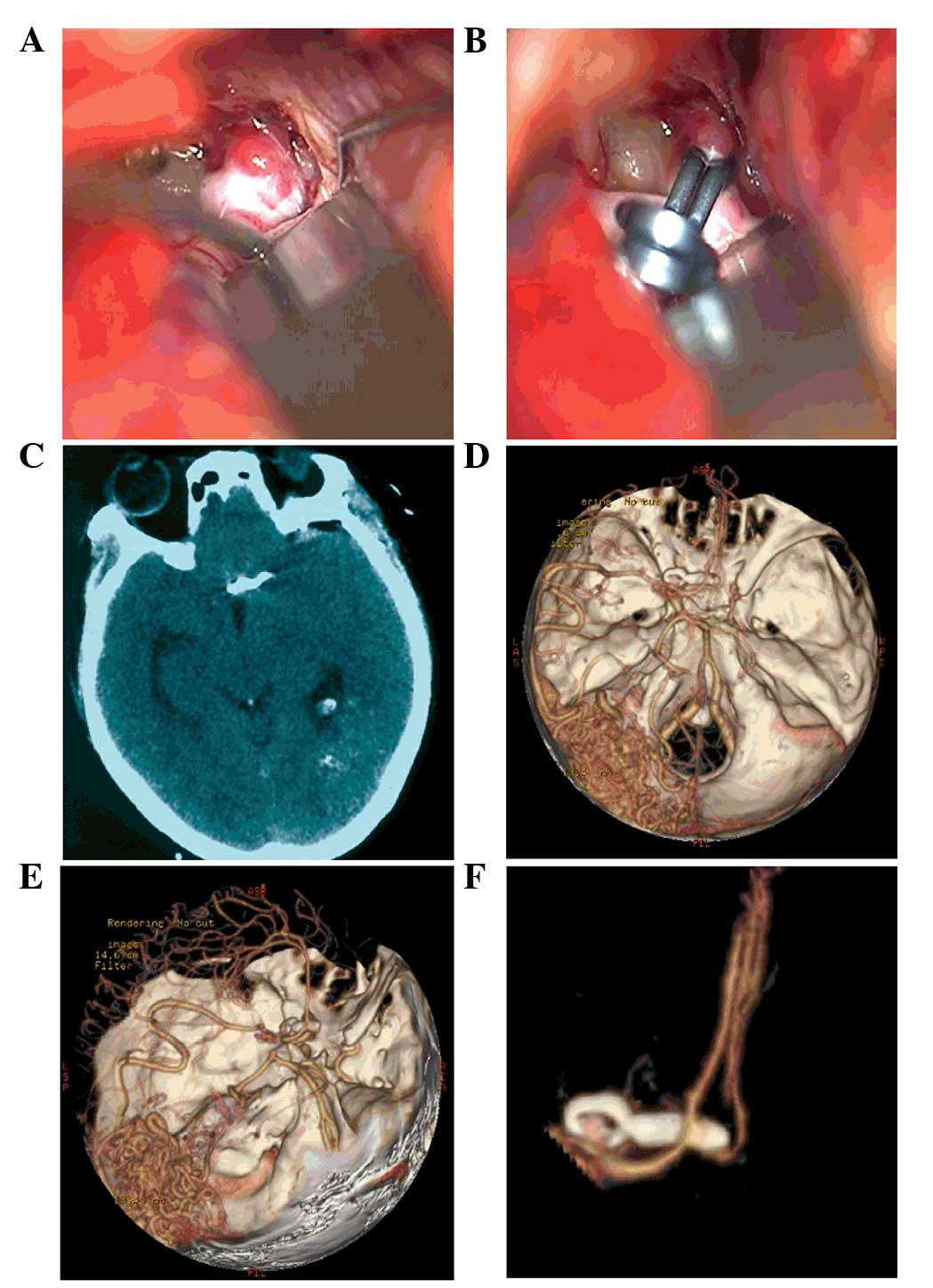 Following admission, the patient underwent aneurysm-clipping surgery (7). Briefly, the sylvian fissure was dissected near the bifurcation of the carotid artery to expose the anterior cerebral artery A1 segment. Subsequently, the anterior communicating artery aneurysm was located and projected to the opposite side. The surgical clipping of the aneurysm was successful, with no intracranial hemorrhage or edema observed in the followed-up CT examination (Fig. 6A and B). The patient recovered well with no complications. At the follow-up CTA conducted six months following the surgical procedure neither an aneurysm recurrence nor any change in the MMD and AVM was observed (Fig. 6C–F). The present study was approved by the Ethics Committee of the First Hospital of Jilin University. Written informed consent was obtained from the patient for the publication of this study.