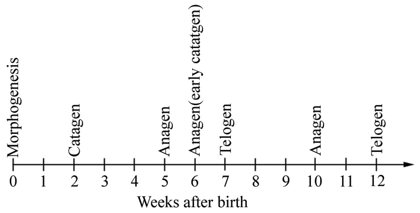 Female C57BL/6 mice (n=5 at each week of age) aged between 3 and 12 weeks (weight range, 9–23 g) were purchased from the Laboratory Animal Center of Guangzhou University of Chinese Medicine (Guangzhou, China). All animal experiments were performed in strict accordance with the recommendations in the Guide for the Care and Use of Laboratory Animals (2014). The mice had access to food and water ad libitum, and were housed in a controlled environment (temperature, 23±2°C; humidity, 55±10%; 12 h light/dark cycle). To collect skin biopsies at each stage of the hair cycle, 6 mice at each week of age were used in this study. To ameliorate animal welfare, the animals were used at a minimum number during the study. As the mice reached their desired age, they were sacrificed by CO2 gas inhalation. To obtain specific hair cycle stage specimens, the dorsal skin of each mouse was excised from just below the line connecting the scapulas. Each skin specimen was separated from the subcutaneous tissue and was sampled by punch biopsy for the examinations. Ethical approval was obtained from the Ethics Committtee of Guangzhou University of Chinese Medicine (approval no. 20141406-63).