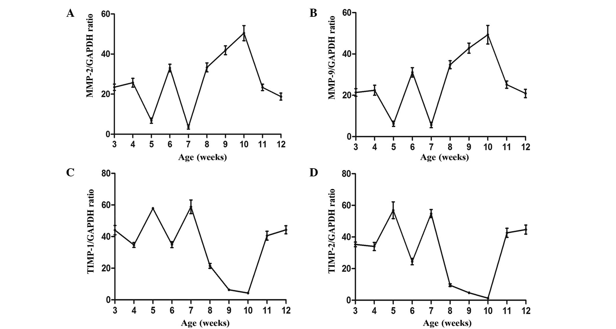 There are a few studies investigating the relationship between MMP-2, MMP-9, TIMP-1 and the hair cycle (25). MMP-2, MMP-9 and TIMP-1 have been suggested to be associated with the hair cycle in vitro and in vivo (26). In addition, the expression profiles of MMP-2, MMP-9, TIMP-1 and TIMP-2 in the hair cycle remain unclear. Therefore, the present study aimed to investigate the expression levels of MMP-2, MMP-9, TIMP-1 and TIMP-2 throughout the hair cycle in mice.