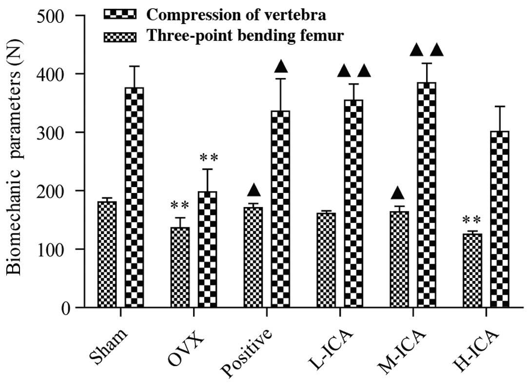 ICA (EPE-120215; purity, 98%) was purchased from Changsha Nutramax Inc. (Changsha, China). Reagent kits for the measurement of serum osteoprotegerin (OPG) and bone Gla protein (BGP) were purchased from Cloud-Clone Corp., (Houston, TX, USA). Reagent kits for the measurement of serum alanine aminotransferase (ALT) and aspartate aminotransferase (AST) were purchased from Sekisui Medical Co., Ltd. (Tokyo, Japan). Reagent kits for the measurement of blood urea nitrogen (BUN) and creatinine (Cr) were obtained from Mike Biotechnology Co., Ltd. (Sichuan, China).