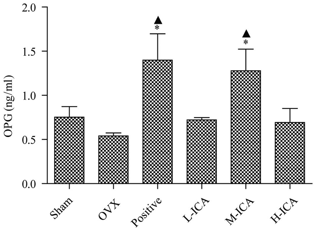 Changes in serum biochemical indicators reflect the balance of bone metabolism in the body. These changes can be used to evaluate bone conversion, and to objectively measure bone resorption and bone formation. OPG and BGP are widely accepted as phenotypic markers of bone formation (18). OPG is a key cytokine secreted by OB that plays an important role in bone remodeling (19,20). A negative correlation has been observed between OPG and BMD (21). BGP is regarded as a marker of bone turnover and serum levels of BGP have been shown to increase with increasing age (22). OPG produced by OB plays an essential role in the formation, differentiation and bone-resorbing activity of OC (23). It has been shown in the present study that OVX rats have reduced OPG activity compared with sham-operated animals. Administration of ICA to OVX rats upregulated OPG activity and downregulated BGP activity. In addition, the M-ICA dose did not cause liver or kidney damage.