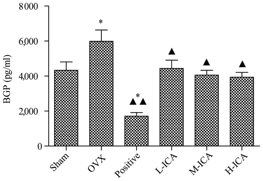 OPG levels in sham-operated and OVX rats were 0.752±0.121 and 0.541±0.034 ng/ml, respectively. OPG levels were significantly increased (P<0.05) to 1.28±0.244 ng/ml following treatment with M-ICA (Fig. 2). BGP levels in the sham-operated group were 4,328±0.476 ng/ml. As compared with the sham-operated group, BGP levels were significantly increased (P<0.05) to 5,983±0.645 ng/ml in the OVX group; however, they were significantly decreased (P<0.05) to 1.713±0.202 ng/ml in the positive group. As compared with the OVX group, BGP levels in the positive, L-ICA, M-ICA and H-ICA groups were significantly decreased (P<0.05) to 1.713±0.202, 4.436±0.477, 4.055±0.273 and 3.939±0.269 ng/ml, respectively (Fig. 3).