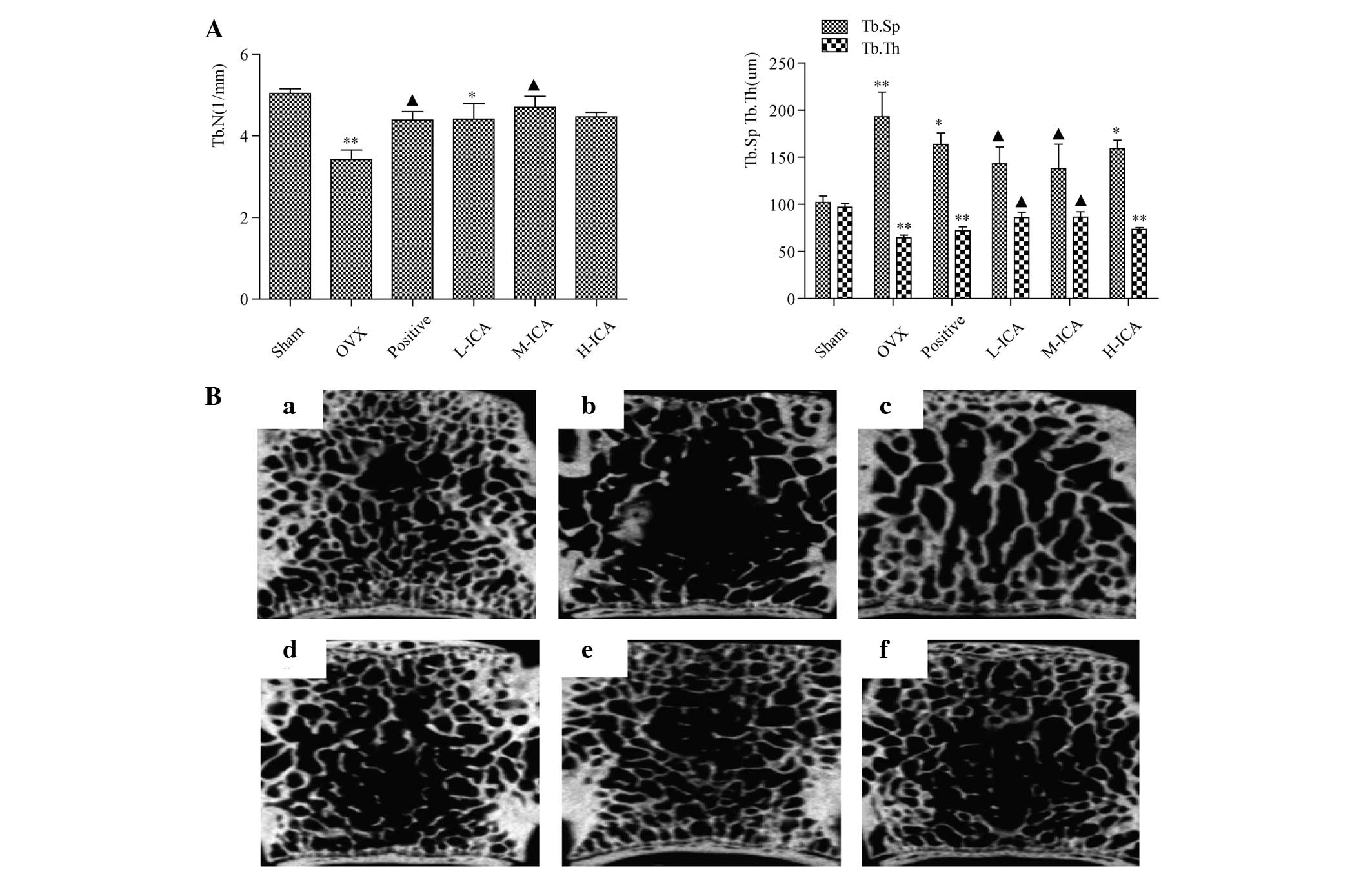 Morphological observations were quantitated by the histomorphometric analysis of longitudinal cross-sections collected 2 cm away from the proximal vertebra using micro-CT. Marked bone loss was observed in the OVX rats compared with the sham-operated group (Fig. 4A). This bone loss was accompanied by a significant reduction in Tb.Th and Tb.N together with a significant increase in Tb.Sp (P<0.01). Treatment with M-ICA normalized Tb.Th, Tb.N and Tb.Sp compared with the OVX group. Compared with the sham-operated group, in the positive group and the H ICA group, Tb.Th was significantly reduced (P<0.01) but Tb.Sp was significantly increased (P<0.05). In the L-ICA group, Tb.N decreased (P<0.05). In the L-ICA group, Tb.N decreased (P<0.05). Compared with the sham-operated group, the bone trabecula was looser in the OVX group. Following 12 weeks of treatment, as compared with the OVX group, the bone trabecula was more dense in the positive group and ICA groups, suggesting that ICA may recover bone trabecula to varying levels. M-ICA was most effective in comparison with the positive group (Fig. 4B).