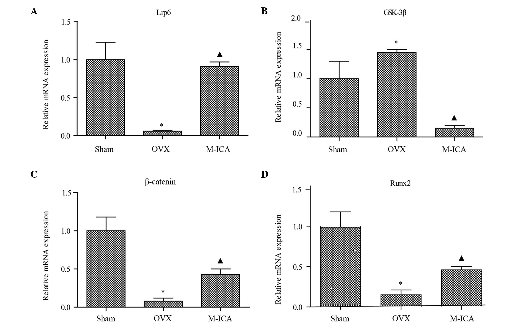 The expression levels of β-catenin, Runx2 and Lrp6 mRNA were reduced in the OVX animals compared with their respective levels in the sham-operated group (P<0.05; Fig. 6). Levels of β-catenin, Runx2 and Lrp6 mRNA in the M-ICA group were significantly increased in comparison with those in the OVX group (P<0.05). The levels of GSK-3β were significantly increased in the OVX group compared with those in the sham-operated group (P<0.05). Furthermore, treatment with M-ICA significantly reduced the expression of GSK-3β compared with that in the OVX group (P<0.05).