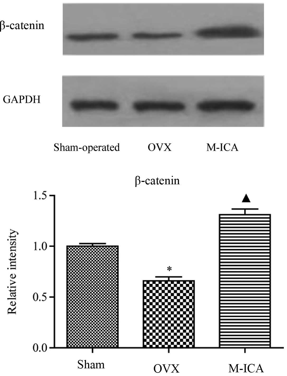 As shown in Fig. 7, following bilateral removal of the ovaries, expression of β-catenin was significantly decreased (P<0.05). Treatment with M-ICA led to significantly increased levels of β-catenin compared with those in OVX rats (P<0.05).