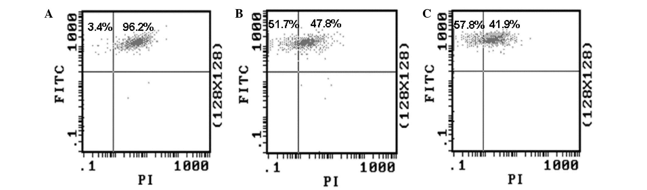 Decreased MMP is a feature of apoptotic cells. In order to determine whether capsaicin and cisplatin can induce apoptosis of MG-63 cells, the effect of the drugs on the MMP was evaluated by FCM. The cells treated by 200 µM capsaicin or 32 µg/ml cisplatin were stained with DiOC6 (3), and the MMP was detected by FCM. The results showed that treatment with both drugs could decrease the ratio of cells with green fluorescence (Fig. 2). This result suggests that capsaicin and cisplatin can induce the alteration of MMP in MG-63 cells, and then initiate endogenous apoptosis.