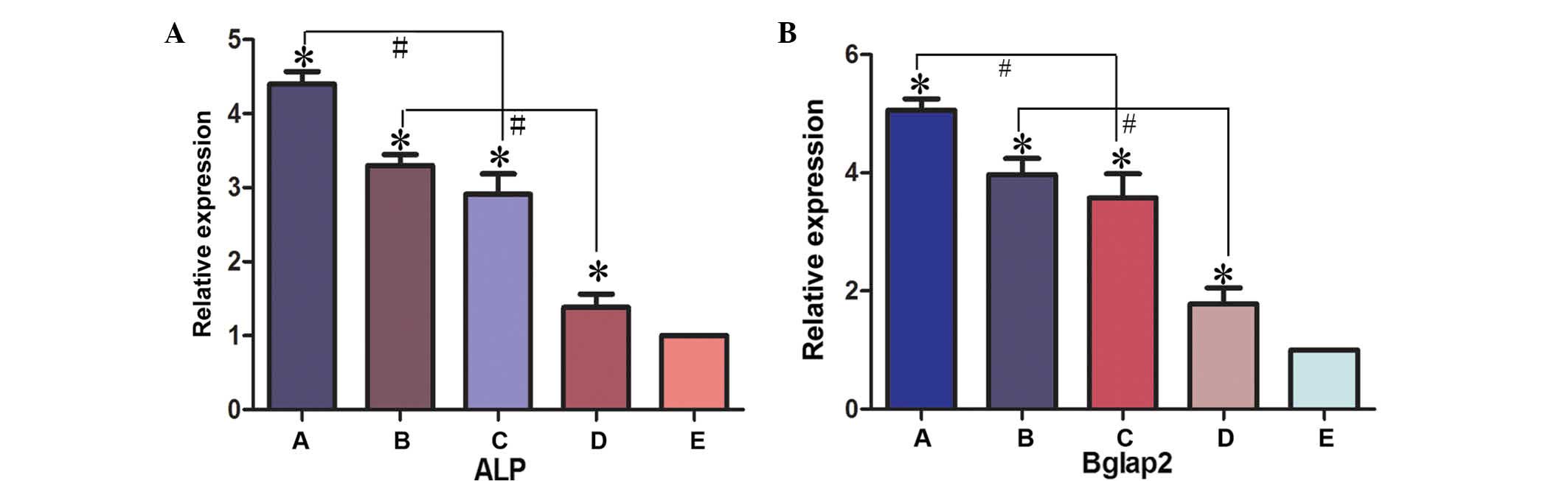 Song Z, Wu C, Sun S, Li H, Wang D, Gong J and Yan Z: Quantitative analysis of factors influencing tissue-engineered bone formation by detecting the expression levels of alkaline phosphatase and bone γ-carboxyglutamate protein 2. Exp Ther Med. 9:1097–1102. 2015.PubMed/NCBI
