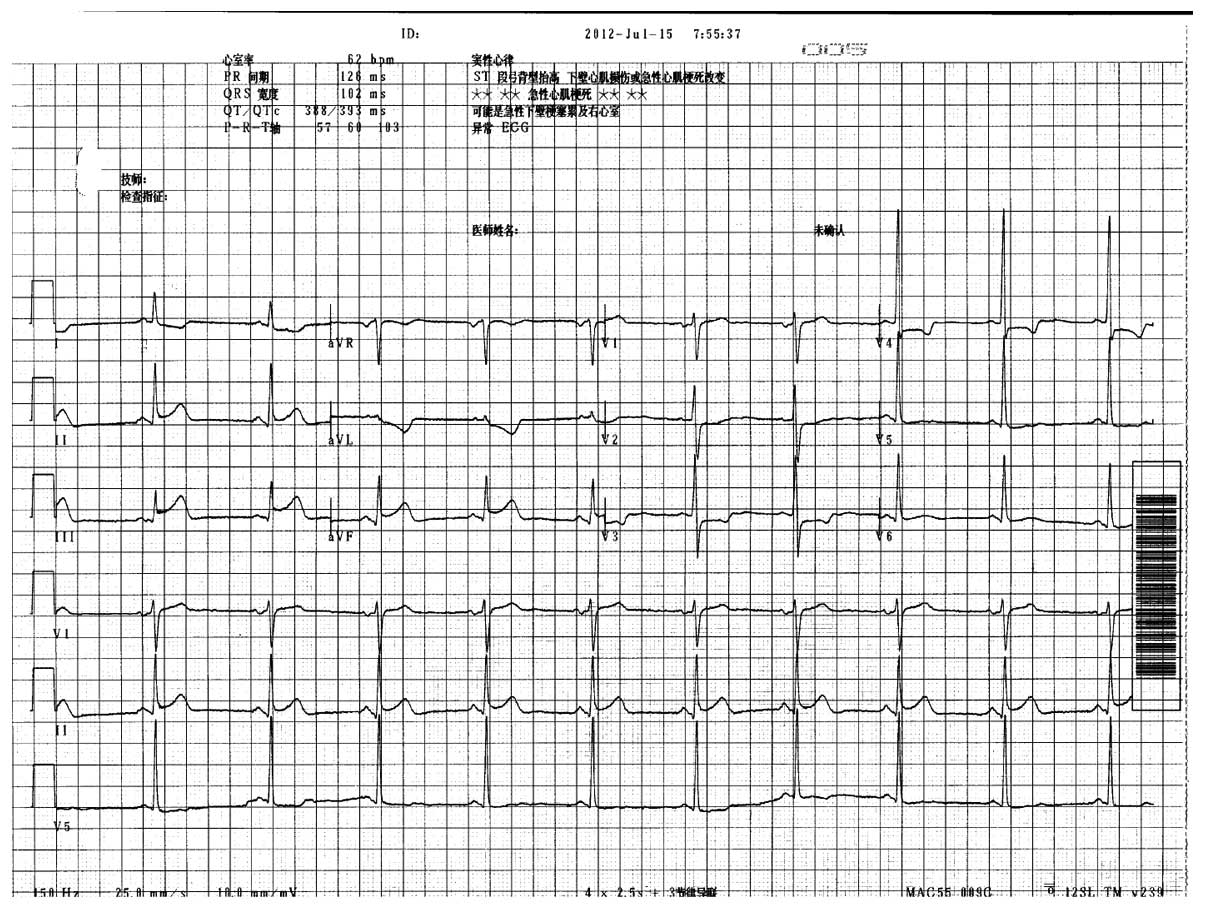 On the seventh morning of GIT and 3 days after the discontinuation of TPO, the patient complained of acute chest pain. Electrocardiography (MAC 5000 ECG Analysis System, GE Medical Systems Ltd.) suggested acute inferior wall myocardial infarction (Fig. 1). The platelet count was 179×109/l (normal range: 100–300×109/l), and the platelet aggregation test showed a value of 62% (normal range: 20–60%, calculated using Turbidimetric platelet aggregometry, aggregation remote analyzer module, Helena Laboratories, Beaumont, TX, USA). In brief, the procedure is as follows: Blood specimen is collected and handled. The aggregation reagents are reconstituted according to the directions of the manual. ADP, epinephrine and collagen reagents should be used undiluted and will have the final concentrations given below when mixed with the PRP during testing. The aggregometer was prepared for use and a 450 µl pipette of platelet poor plasma (PPP) was added to a cuvette. This blank was used to set the 100% aggregation value. The cuvette was incubated at 37°C between one and three minutes. Next, the PPP cuvette was inserted into the appropriate channel and the instrument was set to 100% aggregation, and the cuvette set into the appropriate channel. Next, 50 µl of the aggregating reagent dilutions were added to the PRP cuvette and the percentage of aggregation was recorded (instrument sets 0% when the aggregation agent is added and the channel activated).