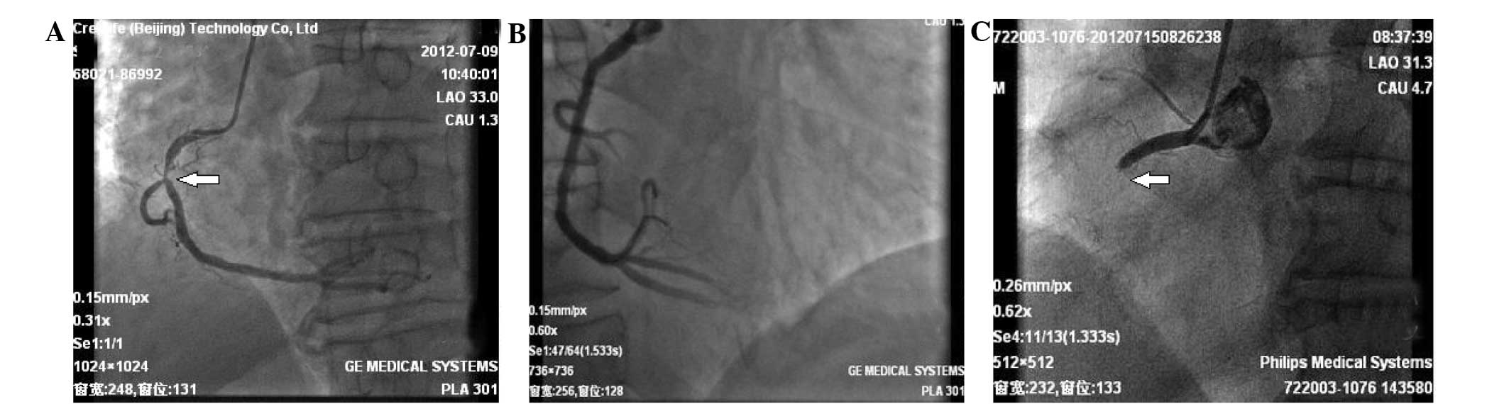 Following intensified antiplatelet treatment with 300 mg clopidogrel and 100 mg aspirin, a repeat coronary angiography (Philips Medical Systems, Eindhoven, Holland) was performed, which showed in-stent thrombosis and total occlusion of the right coronary artery (Fig. 2). After thrombus aspiration, another sirolimus-eluting stent (3.5×33 mm; Firebird; MicroPort Medical Group, Co., Ltd., Shanghai, China) was implanted, and a Thrombolysis In Myocardial Infarction blood flow at level 3 was restored. Dual anti-platelet therapy with 100 mg of aspirin and 150 mg of clopidogrel was applied. Heparin was injected intravenously for anticoagulation.