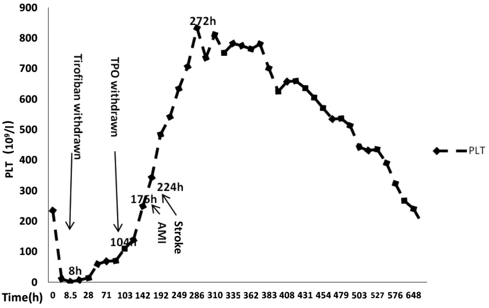 The platelet membrane glycoprotein IIb/IIIa receptor antagonist (GPRA) tirofiban is widely used for the treatment of acute coronary syndrome (ACS). However, tirofiban may induce thrombocytopenia in certain patients (1). Prior studies have shown that the incidence of GPRA-induced thrombocytopenia (GIT) is 1–5% (2), and 0.2–0.5% for severe GIT (3). Tirofiban is currently the only available GPRA in China, and the incidence of GIT caused by tirofiban in the Chinese population has not been reported, to the best of our knowledge. Due to a lack of associated guidelines or expert consensus, treatment of GIT is inconsistent. Thrombopoietin (TPO) is one of the most effective thrombocytopenic medication (4). While there are some reports on TPO in the treatment of heparin-induced thrombocytopenia (HIT) (5,6), it is not clear whether TPO can be effectively used for the treatment of GIT (4).