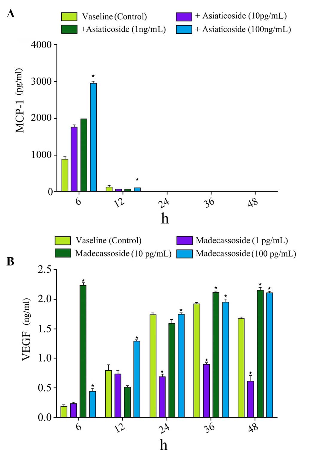 Table II.Effects of asiaticoside and madecassoside on VEGF and MCP-1 production in THP-1 cells on day 7 post-treatment. |