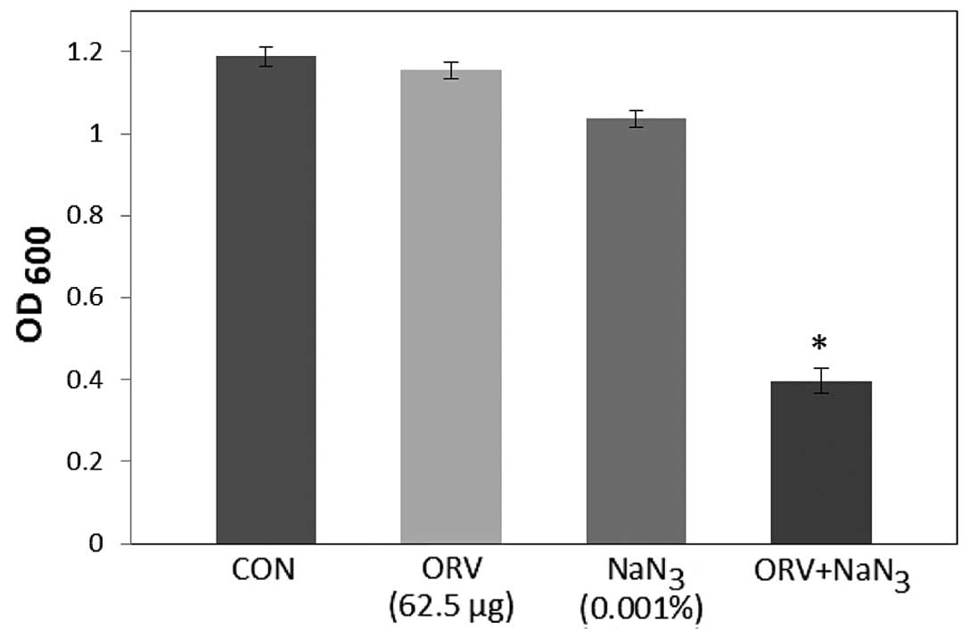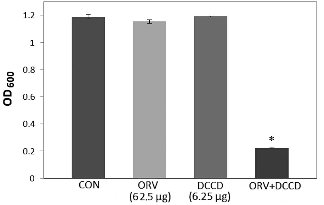The antibacterial activity of ORV in the presence of a detergent, TX, was analyzed to elucidate whether the antibacterial activity of ORV was associated with altered membrane permeability. The activity of ORV in the presence of ATPase-inhibiting agents, DCCD and NaN3, was also examined to determine whether it was associated with multidrug resistance. In order to determine the detergent-induced permeabilization, ORV was mixed with TX (23), since the non-ionic detergent TX is known to greatly increase antibiotic sensitivity (24). DCCD and NaN3, two metabolic inhibitors that decrease the ATP levels by disrupting electrochemical proton gradients in bacteria (25,26), were used as ATPase inhibitors. The antibacterial activity of 62.5 µg/ml ORV was measured in the presence of 0.1% TX, 0.001% NaN3 and 6.25 µg/ml DCCD compared to that of ORV alone, determined by a reading of absorbance [or optical density measured at a wavelength of 600 nm (OD600)] using an Epoch microplate spectrophotometer (Bio-Tek Instruments, Inc., Winooski, VT, USA). This measurement was indicative of cell proliferation.