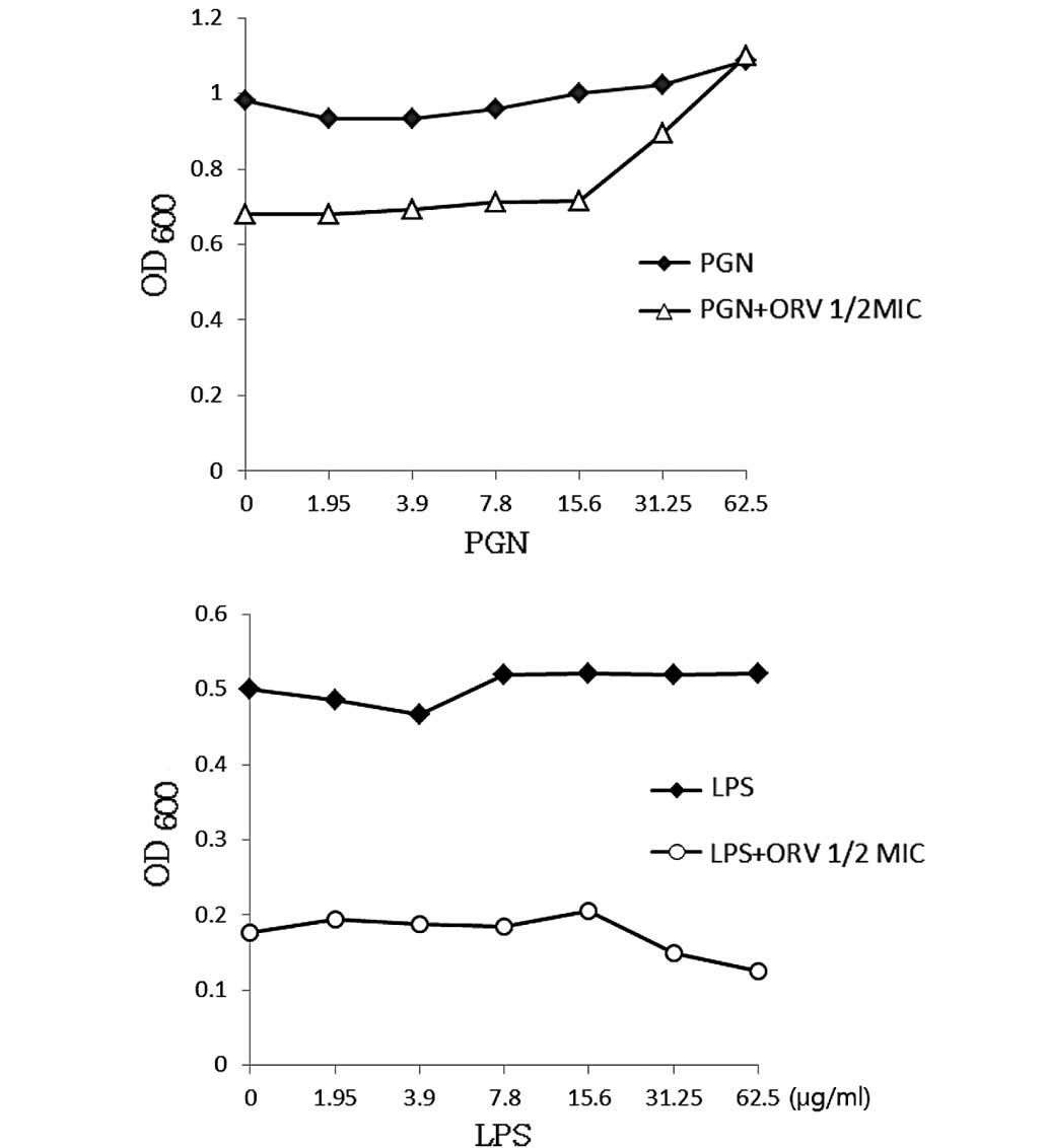 ORV may bind to the cell wall and disrupt its integrity. To confirm the action of ORV upon addition of exogenous PGN, ORV + PGN combination assays were performed using the method described by Zhao et al (27). These assays were used to determine whether ORV directly binds to PGN or disrupts the integrity of the cell wall when the same concentrations of ORV and PGN were combined (0–62.5 µg/ml, i.e. up to 50% of the MIC of ORV). LPS was used as a control.