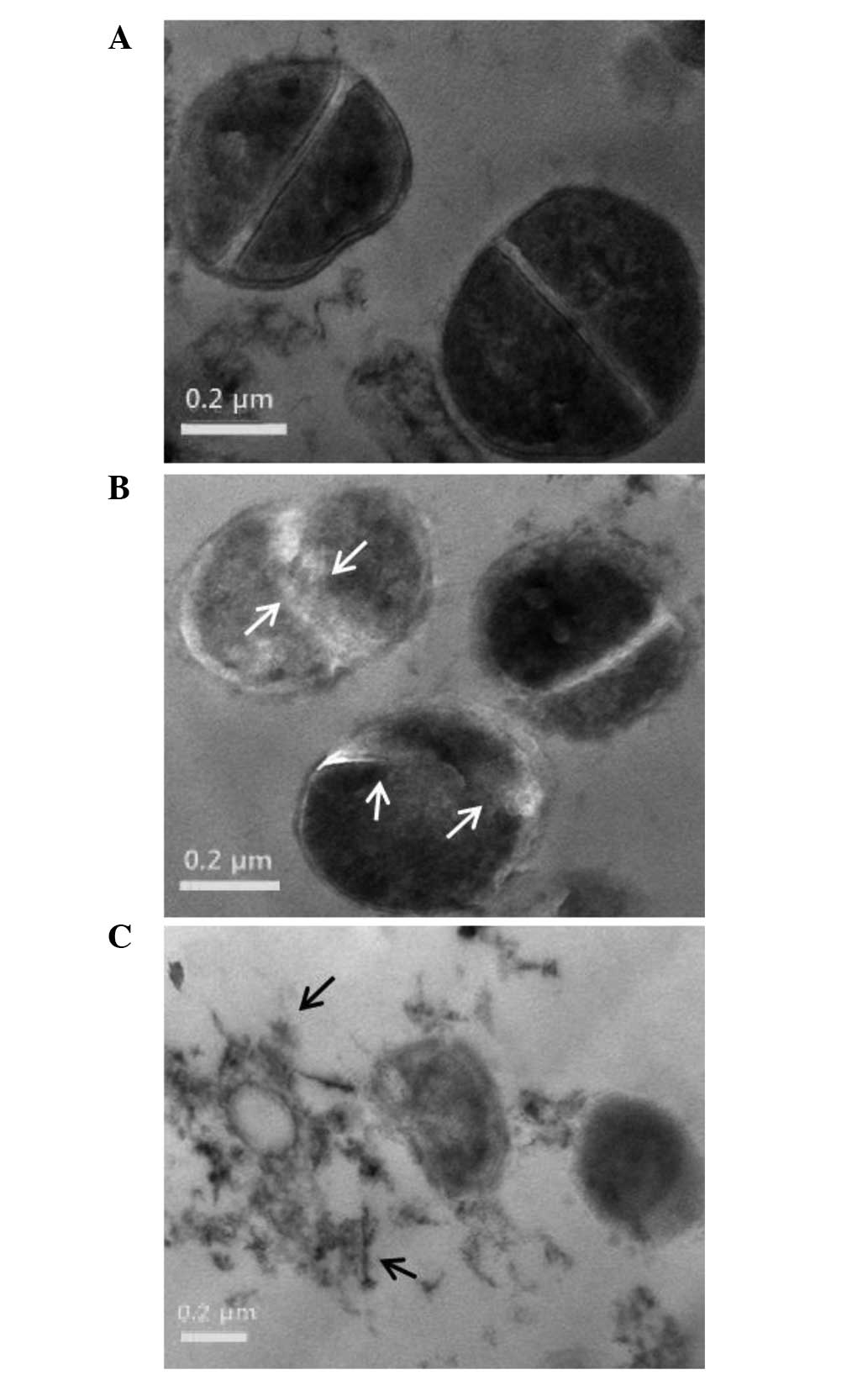 The cell morphology of ORV-treated cells was observed using TEM, which confirmed weakening of the cell wall and lytic effects of ORV on the S. aureus strain, ATCC 33591 (33). The micrographs reported in Fig. 5 illustrate the cell wall and membrane damage following ORV treatment in S. aureus. The control cells demonstrated normal S. aureus morphology with distinct septa (Fig. 5A), whereas bacterial cells treated with ORV at a dose of 62.5 µg/ml (i.e. 50% of the MIC) had a deformed septum and midline disruption (Fig. 5B). In addition, upon exposure of S. aureus to a higher dose of ORV (125 µg/ml, i.e. the MIC), cell division and ghost cells were observed (Fig. 5C). Distinct septa were rarely discerned in the treated cells. TEM observation of ORV-treated MRSA cells substantiates the results indicating that ORV treatment induced altered expression of cell wall- and cell division-associated genes in MRSA.