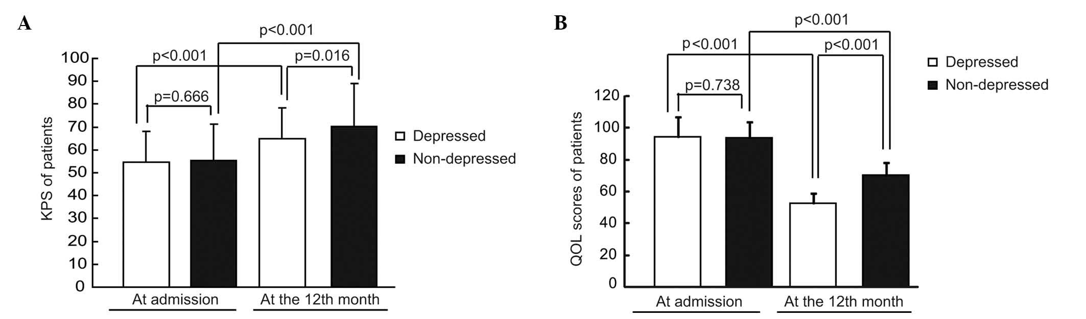 The differences of QOL between the depressed and non-depressed group were analyzed. It was observed that there were no significant differences in the scores of QOL between the depressed and non-depressed groups at admission (P=0.738). At the 12-month follow-up, the QOL scores of patients in both groups significantly decreased (P<0.001 for the depressed group; P<0.001 for the non-depressed group); however, the QOL of patients in the depressed group was significantly lower compared with the non-depressed group (P<0.001; Fig. 2B).