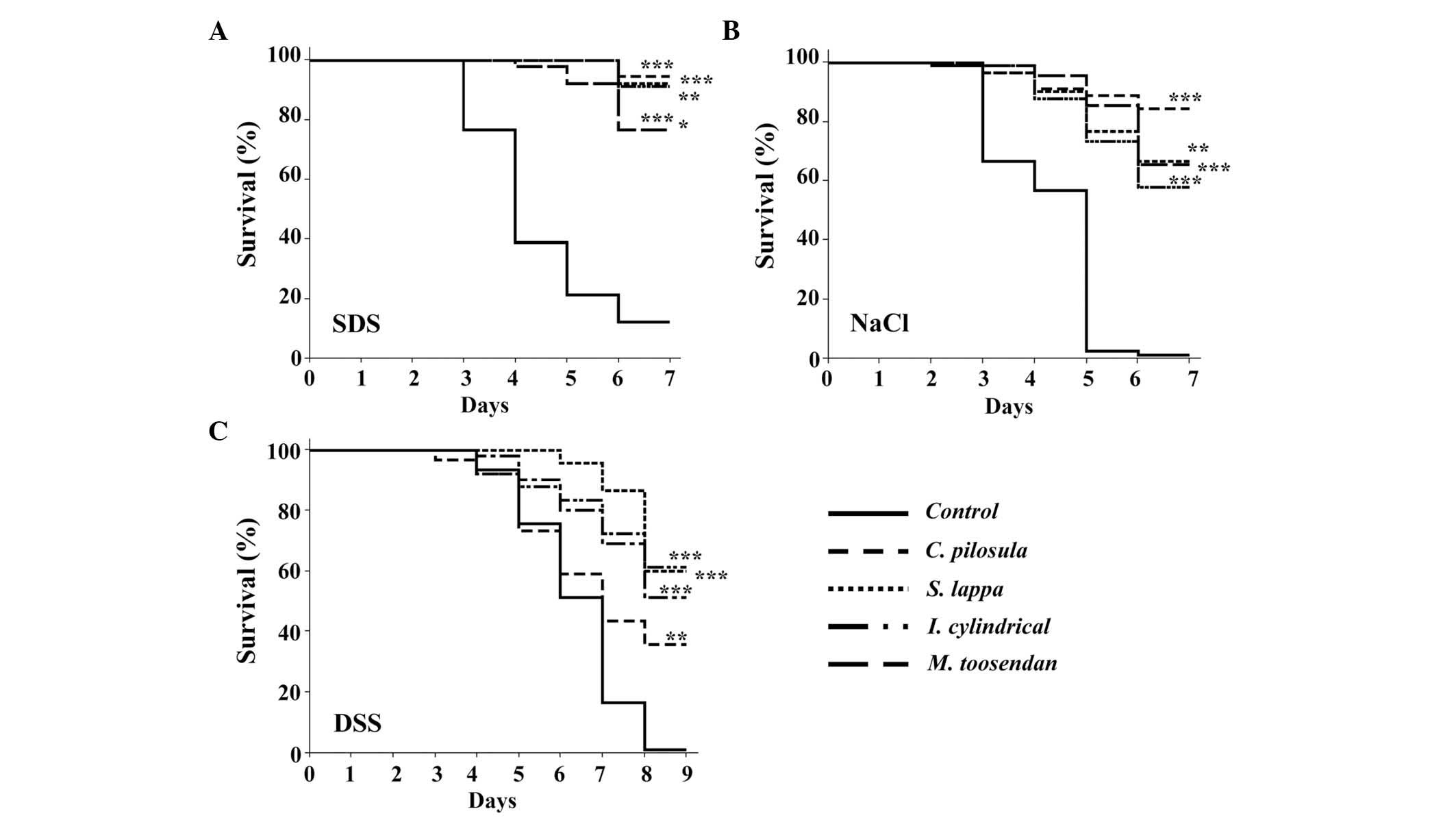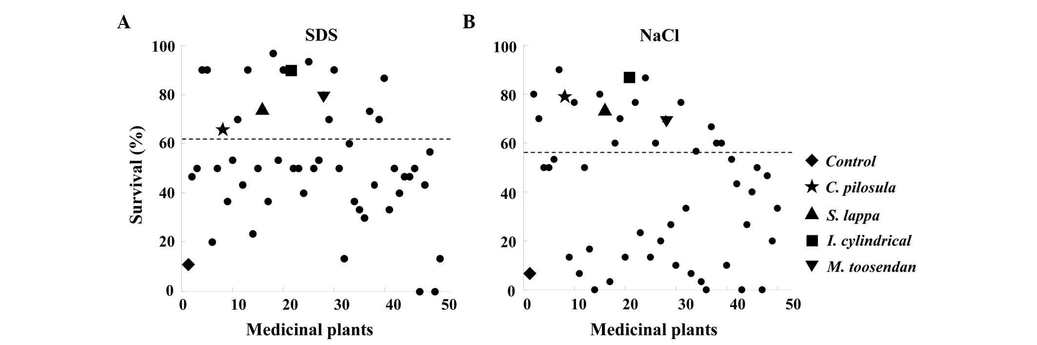In order to screen the protective effects of medicinal plant extracts in vivo, Drosophila were used as a model organism, and adult flies were treated with toxic compounds. Of 50 different medicinal plant extracts, 8 and 9 species significantly increased the survival rates >70% compared with the controls following treatment with SDS or NaCl, respectively (Tables III and IV). Among these extracts, however, a protective effect against SDS or NaCl was not identified. Furthermore, P. multiflorum Thunb., P. notoginseng (Burk) F. H. Chen, L. erythrorhizon Sieb. et Zucc. and C. rotundus L. protect against SDS-induced gut damage but do not increase the survival rate following NaCl treatment. This observation suggests that distinct mechanisms exist for these functions.