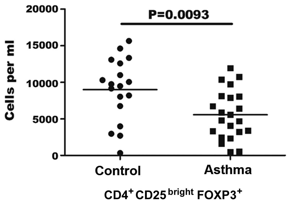 In the present study, the highest intensity of CD25+ staining was ranked as the brightest 0.5% CD4+ CD25+cells for all patient samples. As shown in Fig. 1, the flow cytometric analysis demonstrated that patients with asthma generally exhibited a statistically decreased absolute number of Treg cells in each ml of peripheral blood, compared with the controls. The mean number of Treg cells/ml was found to be significantly lower in asthma patients (5.56±3.3×103/ml) in comparison with the healthy controls (8.98±4.3×103/ml; P=0.0093). In addition, the proportion of CD4+ CD25bright FOXP3+ Treg cells among PBMCs was 0.012–0.51% in asthma patients and 0.121–0.55% in the control group (data not shown).