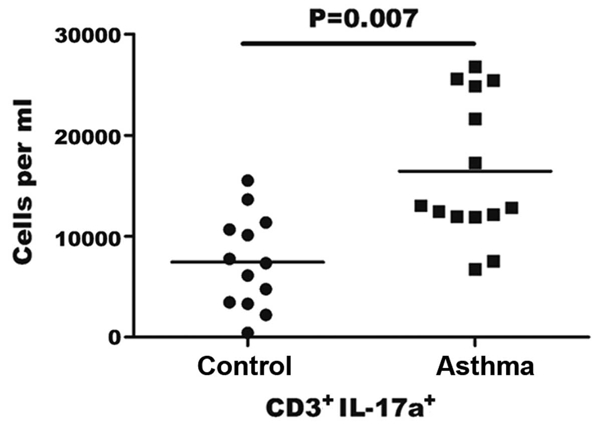 The count of Th17 cells in the blood was assessed by flow cytometry in order to determine whether it was altered in asthma patients compared with the controls. As the stimulation of PMA/ionomycin can lead to decreased human CD4 expression, CD3+CD8− was selected as a marker for CD4+ Th17 cells, according to a previous study (23). CD3+CD8− gating was performed in PBMCs to identify IL-17+ cells by distinguishing Th17 cells from the cluster of T cells in PBMCs. The results indicated that the percentage of Th17 cells in the sample of PBMCs in asthma patients was 0.36–1.25%, while this percentage was 0.10–0.49% in the control group (data not shown). As shown in Fig. 2, the number of Th17 cells per ml was significantly higher in the blood of asthma patients when compared with the control group (16.45±7.0×103/ml vs. 7.44±4.60×103/ml, respectively; P=0.007).