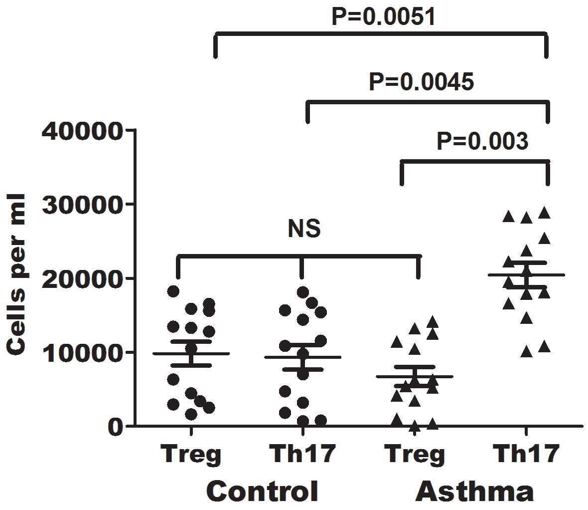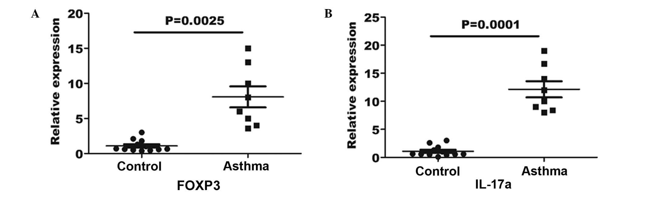 Asthma is a disease that features chronic bronchial inflammation, exaggerated bronchial response and airway obstruction (1). Immune tolerance has been demonstrated to be mediated by regulatory T (Treg) cells, defined as a sub-population of CD4+ T cells that mediates the immune reaction in the lungs through the prohibition of the proliferation and activities of effecting factors secreted by other T cells (2). T helper 17 (Th17) cells consist of a definitive lineage of pro-inflammatory Th cells, which serve a major role in autoallergic diseases (3). Experimental data have suggested an association between the pathology induced by Th17 cells and the regulatory role of Treg cells (4). Murine models have demonstrated that Th17 cells induce autoimmune response by promoting tissue inflammation and activating the innate immune system (5). Treg cells, a subgroup of T lymphocytes with features of immune repression on effector T cells, can be recognized by the expression of the high affinity α-chain receptor of interleukin (IL)-2, namely CD25. However, CD25 is also an upregulated marker of the activated CD4+ T cells, and is thus considered as a non-exclusive marker. In addition, further distinction of CD4+ CD25high Treg cells from other T cells can be achieved based on the selective expression of the forkhead box P3 (FOXP3) transcription factor, since this expression has a central role in the growth and function of Treg cells (6). Although the underlying mechanism through which the proliferation of other T cells is suppressed by Treg cells has not been elucidated, previous evidence has revealed that Treg cells are involved in the prevention of autoimmune response and the control of pulmonary and gastric inflammation in vivo (7,8).