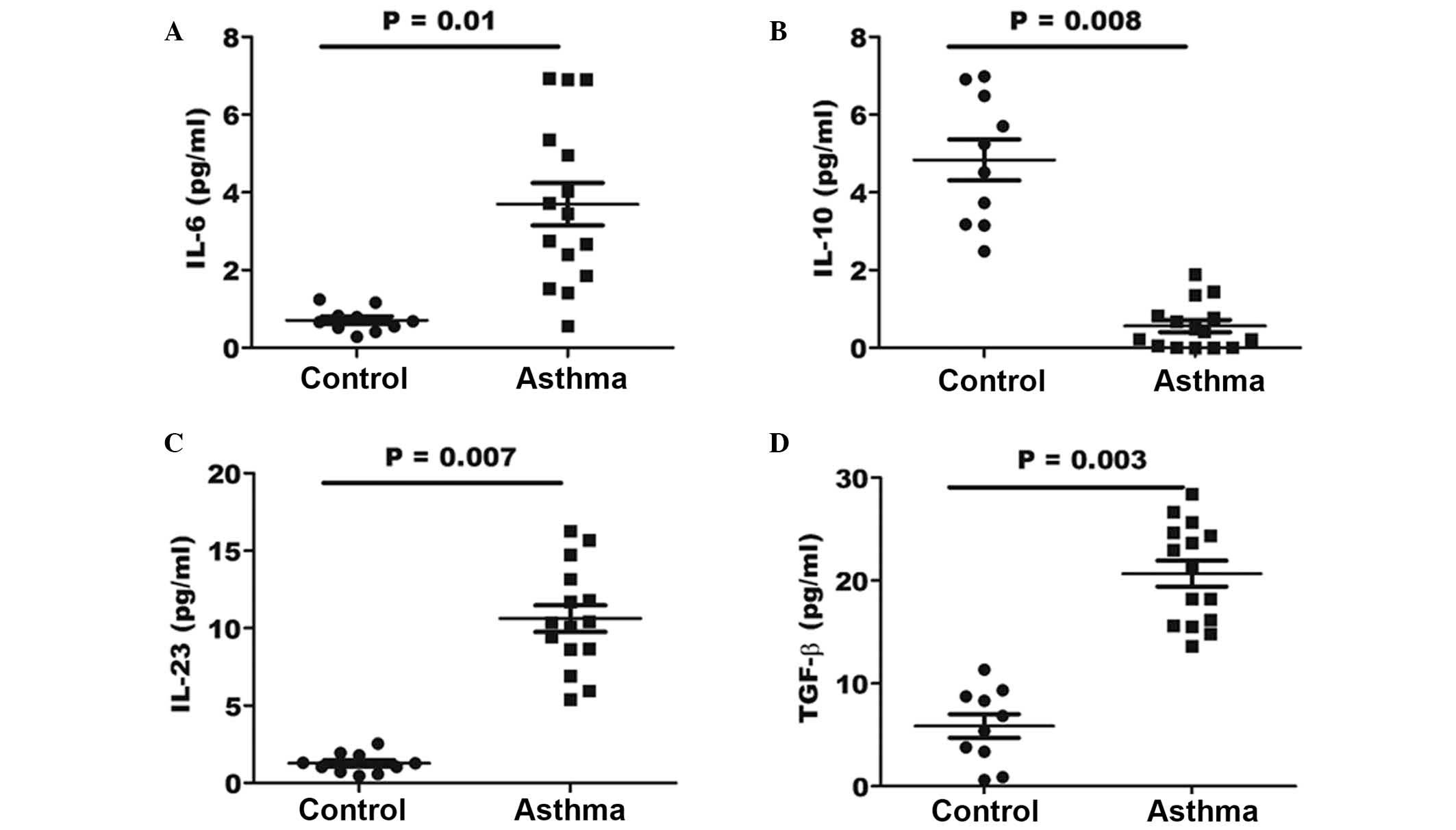 In order to determine whether the effect of cytokines in the lungs of asthma patients may be beneficial for the generation of pathological Th17 cells, the expression levels of various associated cytokines were investigated by ELISA. The concentration of the IL-6, IL-10, IL-23 and TGF-β cytokines was determined in the BALF specimens of asthma and control patients. As shown in Fig. 5, the results indicated a significantly elevated concentration of IL-6, IL-23 and TGF-β in the BALF of asthma patients (P=0.01, 0,007 and 0.003, respectively) when compared with that in healthy controls. However, the expression of IL-10 in the BALF samples of asthma patients was significantly lower when compared with that of control individuals (P=0.008).