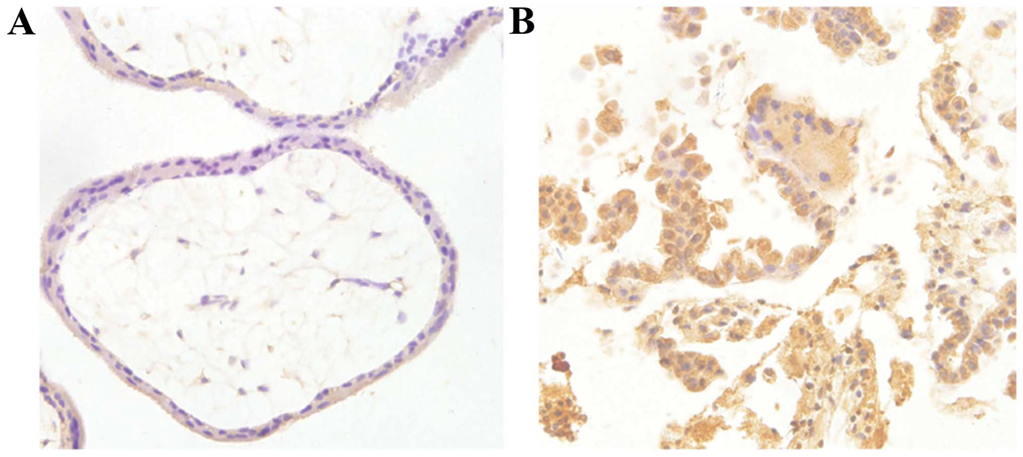 TP53 protein was mainly expressed in the nucleus, shown as brown or brownish yellow granules. The TP53 protein expression level in the recurrent abortion group was significantly increased as compared to the expression noted in the healthy control group (Fig. 2).