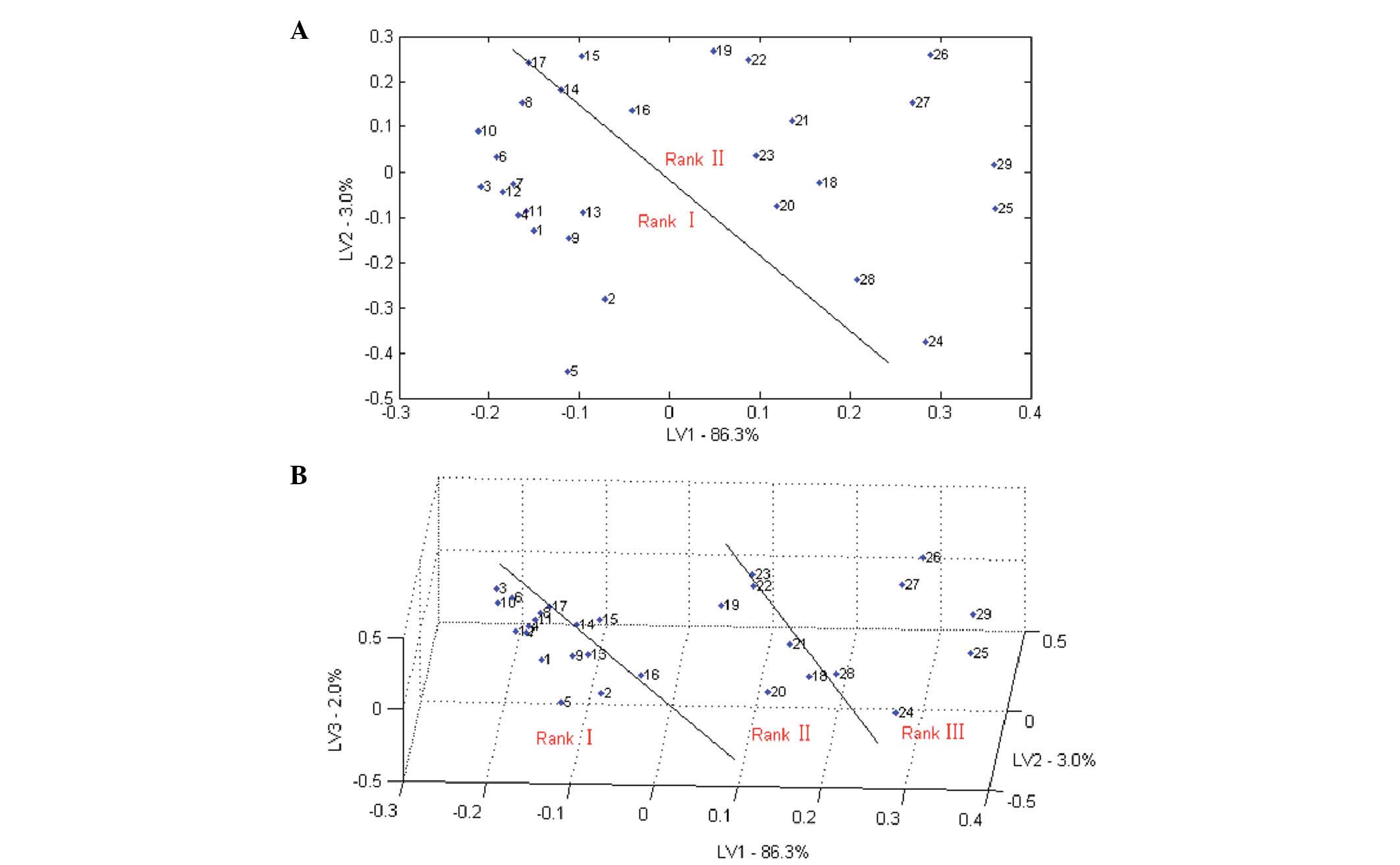 PLS regression analysis was conducted on latent variables. Then, the projection scoring factors in principal component space were used to produce the two- and three-dimensional classification results.