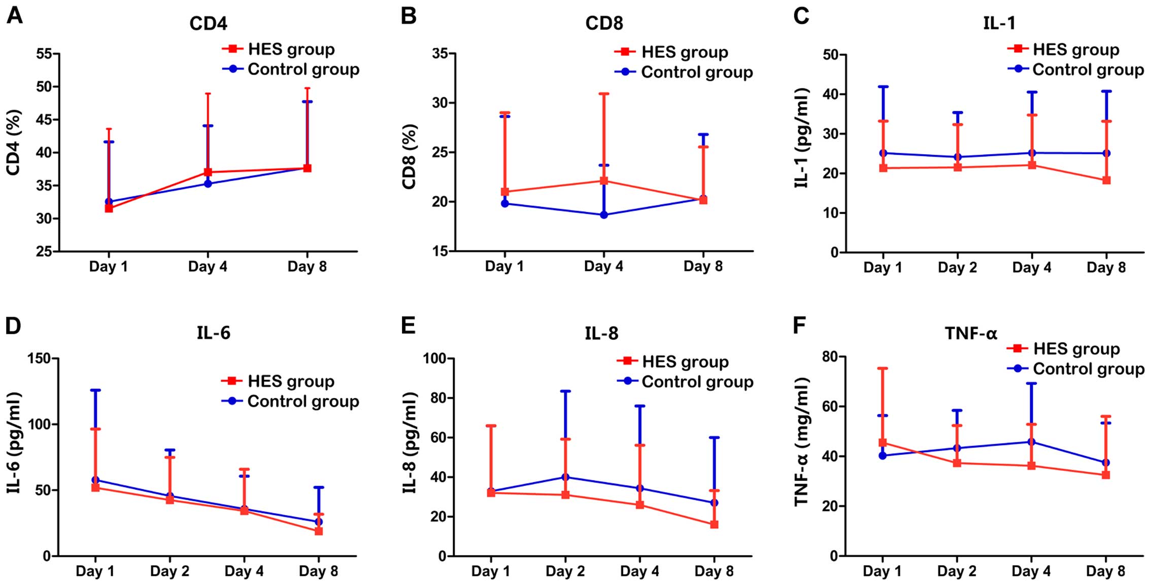 Fig. 1 shows the difference in the lymphocyte subset rates and inflammatory cytokine levels between the two groups. CD4+CD8+ T-cell rates were comparable on days 1 and 8 after hospitalization, whereas the CD4+CD8+ T rate was higher on day 4 after hospitalization (Fig. 1A and B). Lower levels of IL-1, IL-6 and IL-8 were detected in the HES group compared with the control group on days 1, 2, 4 and 8 after hospitalization (Fig. 1C-E). Higher TNF-α level was detected in the HES group on day 1 (Fig. 1F). We also observed lower level of TNF-α on days 2, 4 and 8 in the HES group compared with the control group (Fig. 1F).