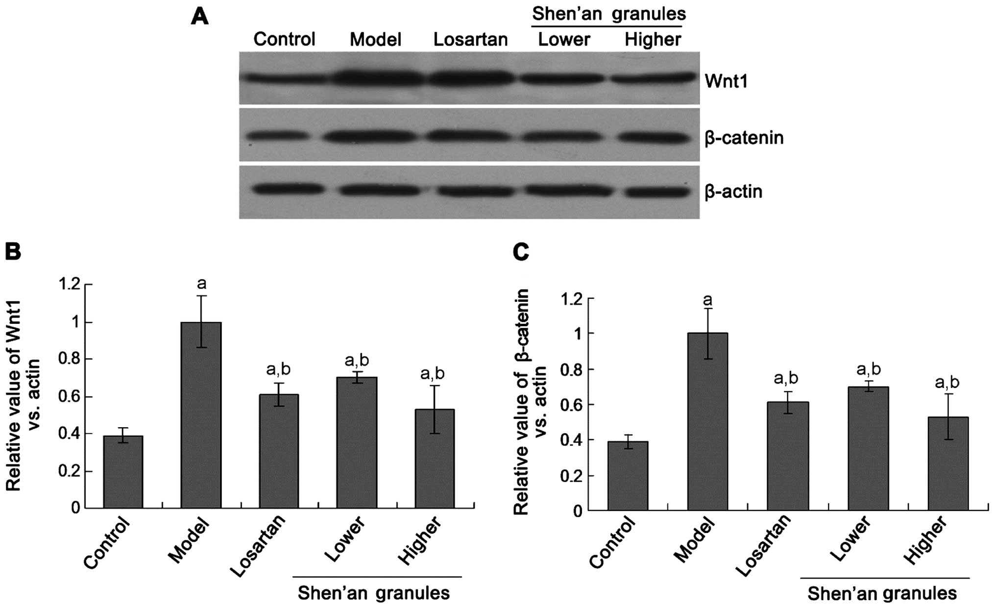To investigate the mechanism of the effects of Shen'an granules treatment, the Wnt pathway molecule was detected. The western blot assay showed that Wnt1 protein expression in groups D and E was significantly decreased compared to group B (Fig. 1; p<0.05). Additionally, there was no significant differences between the Shen'an granules treatment group (groups D and E) and the losartan treatment group (group C) (p>0.05). There were also no significant differences between the lower (group D) and higher (group E) Shen'an granules treatment group (p>0.05).