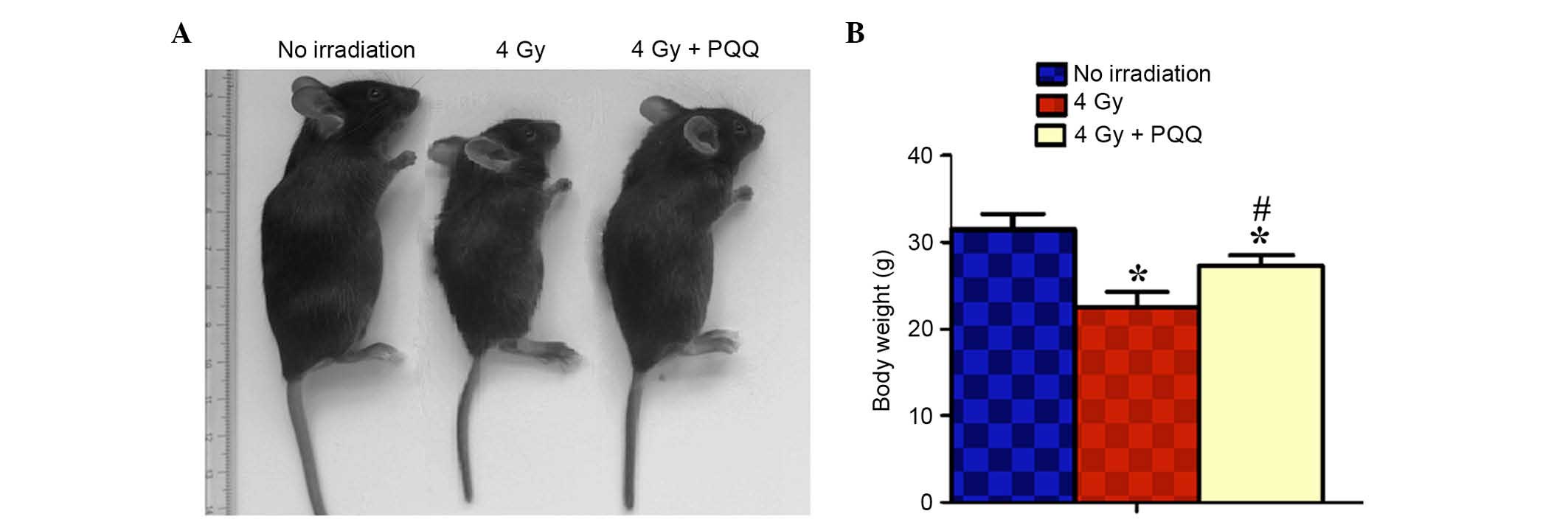 In order to investigate the effect of PQQ on C57BL/6J mouse phenotype, in vivo, all animals were divided into three groups of 5 mice (no irradiation, 4 Gy and 4 Gy + PQQ). Statistical analysis was performed regarding phenotype and body weight in the different groups.