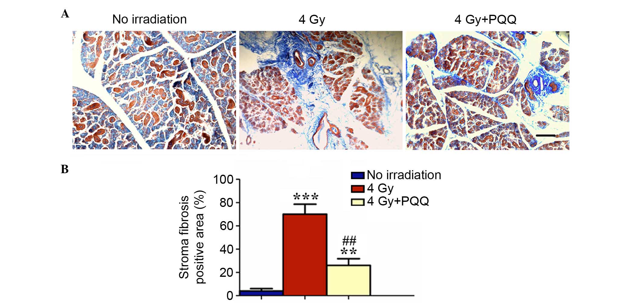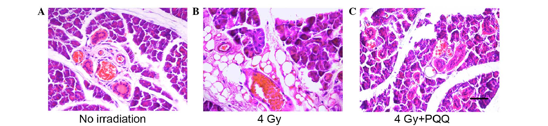 In vitro, it is well established that PQQ can continuously neutralize ROS to convert it to non-reactive molecular products and thereby protect plasmid DNA and protein from oxidative damage (23). These results suggest that PQQ, as an ROS scavenger, may directly protect the mitochondrial function, and prevent premature senescence through the neutralization of ROS. Therefore, the present study hypothesizes that PQQ can inhibit oxidative stress, decrease the level of ROS, protect mitochondrial function, and serve a radioprotective role in parotid gland damage induced by TBI in C57BL/6J mice.