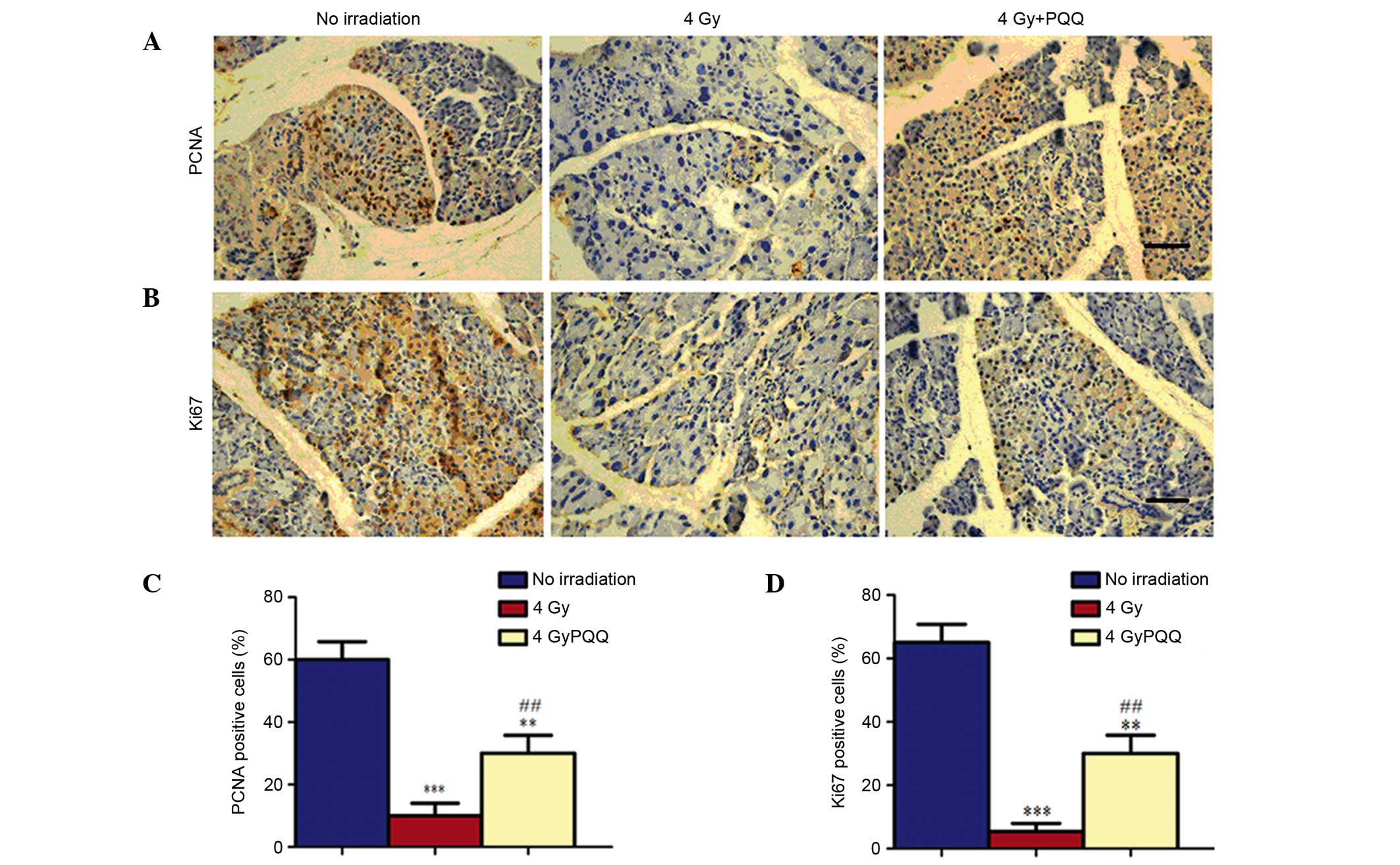 Since the number of acinar cells decreased in the parotid glands of 4 Gy mice, which was rescued by a PQQ-supplemented diet, it was determined whether the change in number of acinar cells was caused by the effects of TBI treatment and PQQ-supplemented diet on cell proliferation using immunohistochemical staining of PCNA and Ki67 (Fig. 4A and B). Results showed that numbers of PCNA and Ki67 positive cells were significantly decreased in the parotid gland of 4 Gy mice compared with mice not exposed to irridation (P<0.001; Fig. 4C and D). However, a PQQ-supplemented diet significantly enhanced the PCNA and Ki67 positive cells in 4 Gy + PQQ mice compared with 4 Gy mice (P<0.01), but the overall levels remain lower than no irradiation mice (Fig. 4C and D).