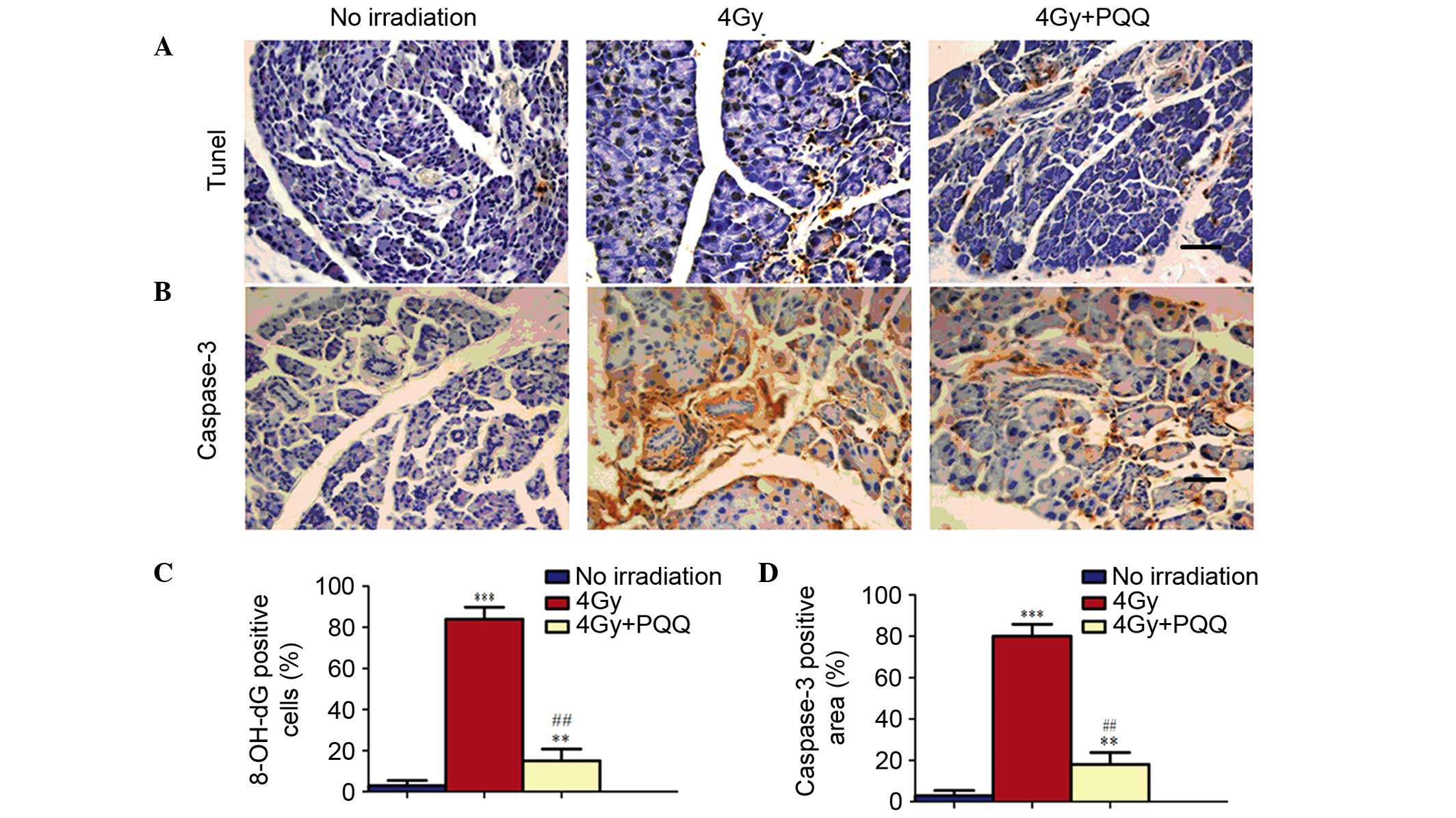 Since a decrease was observed in proliferation in parotid glands of 4 Gy mice and was partially rescued by a PQQ-supplemented diet, it was further examined whether TBI and PQQ also affect apoptosis using TUNEL and immunohistochemical staining of caspase-3 (Fig. 5A and B). Results showed that few TUNEL- and caspase-3-positive apoptotic cells existed in no irradiation mice. However, TBI treatment significantly induced cell apoptosis (P<0.001). Importantly, a PQQ-supplemented diet significantly ameliorated the increase of apoptotic cells in 4 Gy mice (P<0.01), but the number of apoptotic cells remained higher than in no irradiation mice (Fig. 5C and D). These results show that TBI treatment decreases the acinar cell number by inhibiting cell proliferation and promoting cell apoptosis, which was partially rescued by PQQ-supplemented diet in 4 Gy mice.