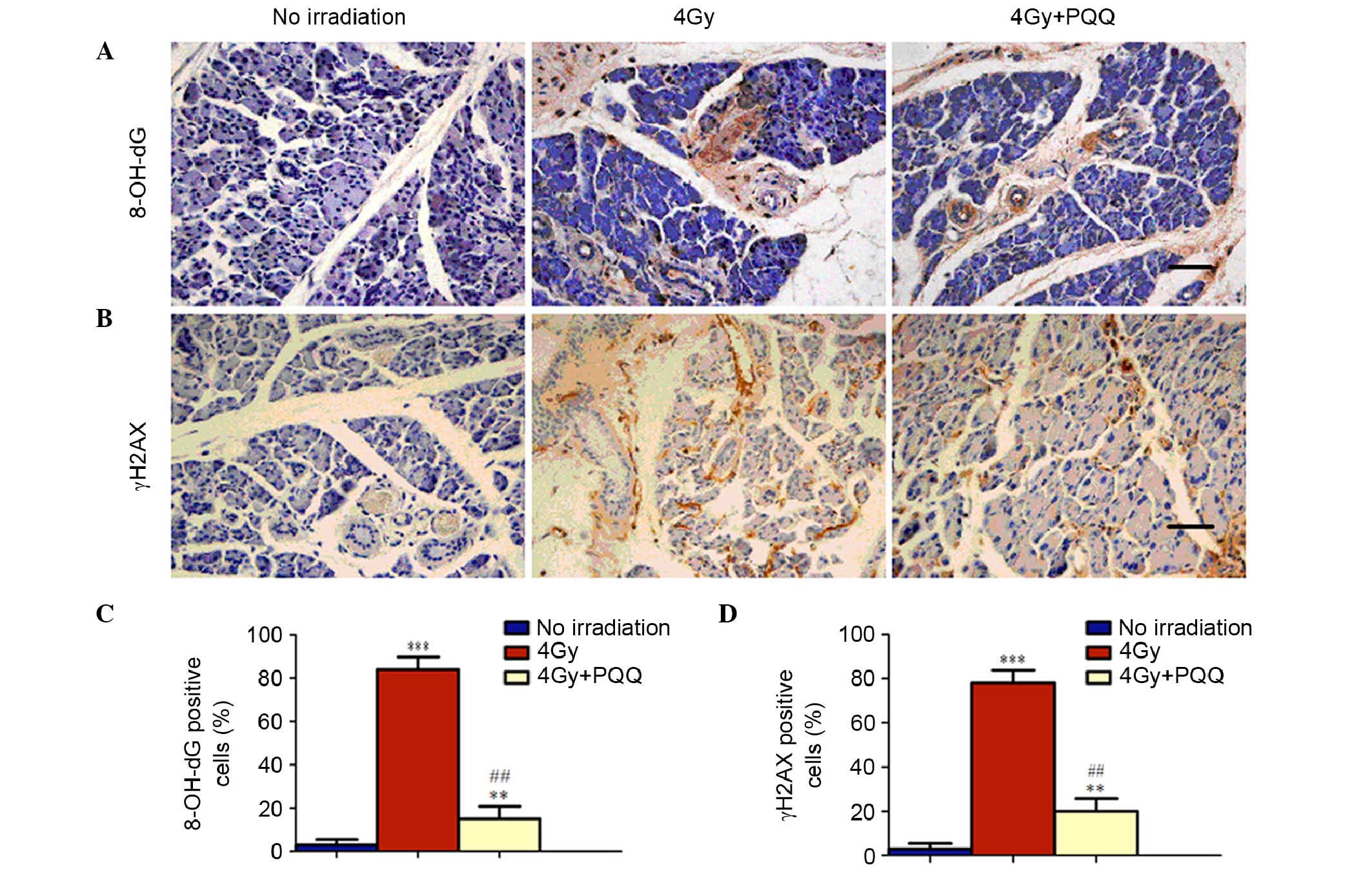 It is understood that the primary mechanism underlying radiotherapy of malignant tumors is to increase DNA double strand breaks. To determine whether PQQ reduces DNA damage of parotid glands induced by TBI, immunohistochemical staining of two most commonly used markers for double strand DNA breaks, 8-OH-dG and γH2AX, was performed (Fig. 6A and B). The results found that TBI treatment significantly induced cell DNA damage (P<0.001), as indicated by the expression of 8-OH-dG and γH2AX. This increased DNA damage was significantly reduced by a PQQ-supplemented diet (P<0.01; Fig. 6C and D). Therefore, these results suggest that TBI treatment increases cell apoptosis by enhancing double strand DNA damage, which is be ameliorated by a PQQ- supplemented diet in 4 Gy mice.