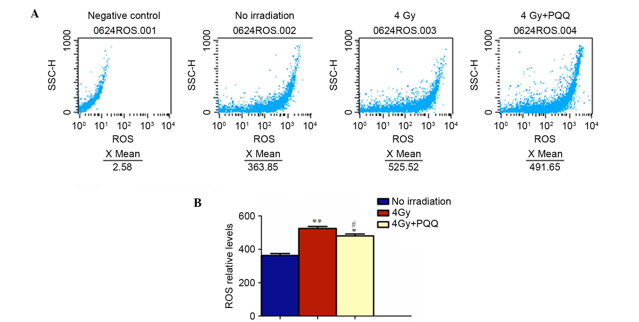 It has been demonstrated that TBI increases ROS levels and hydroxyl-free radicals by oxidative stress, which subsequently results in the increase of DNA double strand breaks (5). The results showed that PQQ-supplemented diet decreased TBI-induced double strand DNA breaks in parotid glands. To determine whether PQQ inhibits ROS formation, ROS levels were examined by flow cytometry (Fig. 8A). The results showed that the increased ROS levels in TBI mice were significantly inhibited by a PQQ-supplemented diet (P<0.05; Fig. 8B). To further explore whether this effect of PQQ was associated with the enhanced expression of various antioxidant proteins, a western blot was performed to examine the expression of PRDX I, PRDX IV, SOD1, SOD2 and DNA break maker, γH2AX (Fig. 7A). Results showed that all the antioxidant proteins were downregulated in TBI mice and that DNA break maker, γH2AX, was upregulated compared with no irradiation mice, which was consistent with immunohistochemical staining results. Strikingly, the expression levels of all the antioxidant proteins were increased markedly and γH2AX was decreased significantly in 4 Gy+PQQ mice compared with 4 Gy mice (P<0.05; Fig. 7D-G and I). These data suggested that PQQ can reduce DNA damage through upregulating antioxidant abilities.