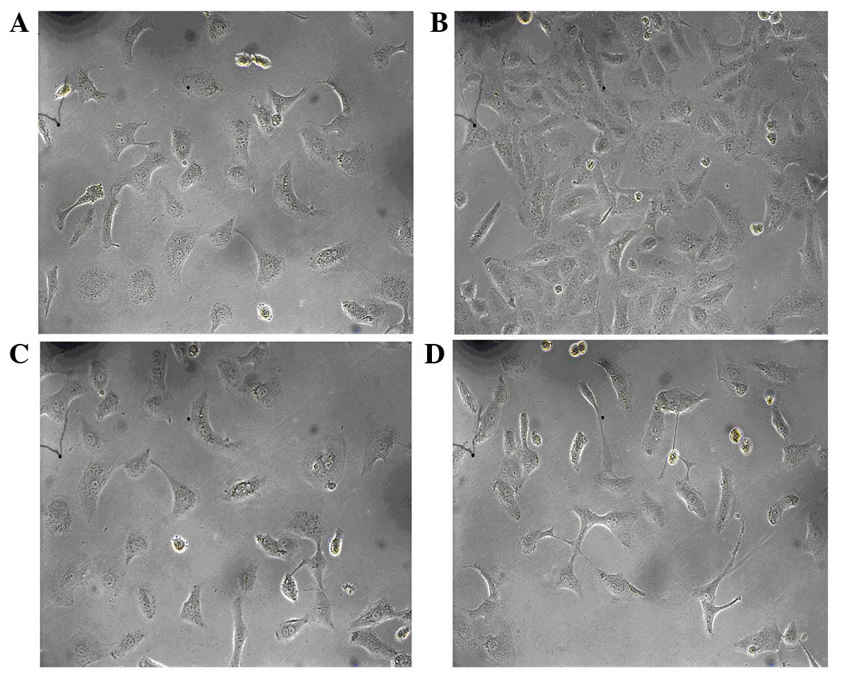 To assess the effect of allicin on cell morphology, HK-2 cells were serum deprived for 24 h and exposed to high glucose conditions for 48 h, after which the cells were observed by inverted phase-contrast microscopy. The normal group had the typical epithelial cuboidal shape, with a cobblestone morphology (Fig. 2A). Conversely, cells in the high glucose group exhibited an elongated, fibroblast-like phenotype (Fig. 2B). Simultaneous incubation with allicin (20 µg/ml) or PD98059 (20 µg/ml) prevented the high glucose-induced morphological changes in the majority of cells, with cells retaining epithelial polarity and a cobblestone growth pattern, in the absence of hypertrophy and an elongated morphology (Fig. 2C and D).
