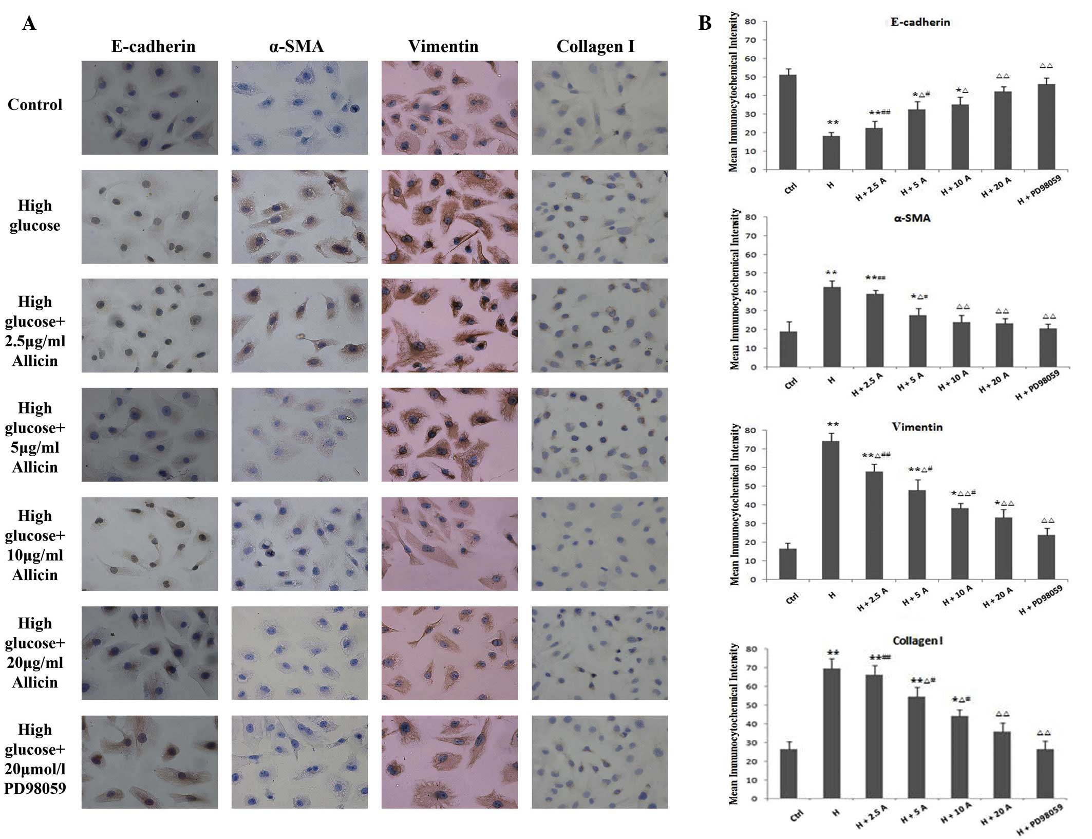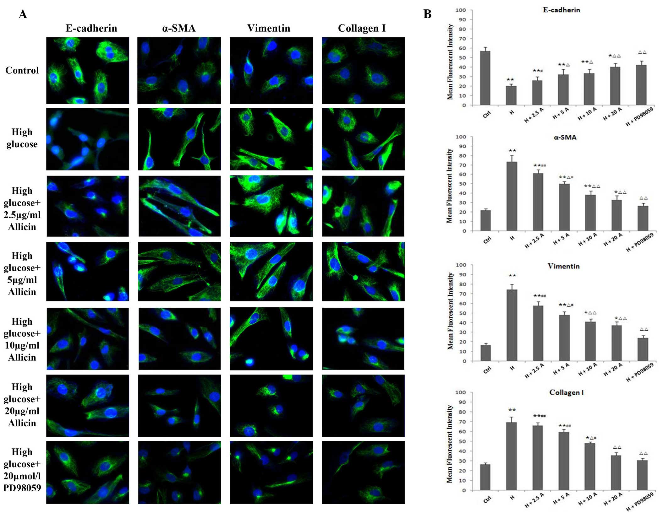 HK-2 cells were cultured in DMEM containing 5.5 mmol/l D-glucose. Upon reaching 80% confluence, cells were synchronized with FBS-free medium (5.5 mmol/l D-glucose) for 24 h, then cultured with or without various treatments for 48 h. Subconfluent cells were incubated with serum-free medium for 24 h and divided into four groups, as follows: i) Normal glucose (5.5 mmol/l; control group); ii) high glucose group (25 mmol/l); iii) high glucose (25 mmol/l) plus allicin (2.5, 5, 10 or 20 µg/ml) group; and iv) high glucose (25 mmol/l) plus PD98059 (20 µmol/l) group. Following treatment, the cells were incubated for 48 h. Cells were then fixed in 4% paraformaldehyde for 30 min, permeabilized with 0.1% Triton X-100 for 15 min and incubated with 10% normal goat serum blocking buffer for 1 h at 37°C. Subsequently, the cells were incubated overnight at 4°C with rabbit anti-α-SMA (1:200), rabbit anti-vimentin (1:200), mouse anti-E-cadherin (1:200) and mouse anti-collagen I (1:100) monoclonal antibodies. Cells were then incubated with FITC-conjugated secondary antibody (1:200) for 1 h at 37°C in the dark, then stained with propidium iodide for 1 h. The negative control consisted of cells incubated with IgG instead of primary antibody. Cells were visualized and photographed using a laser scanning confocal microscope (Olympus Corp., Tokyo, Japan). Olympus FluoView (Olympus Corp.) and Velocity 4.1 (Improvision; Velocity Software Inc, Mountain View, CA, USA) software were used for image processing, deconvolution, and quantitative imaging analyses wherever appropriate. Confocal images acquired under the identical exposure time and instrument settings among different groups were used for colocalization and quantitative fluorescence intensity analyses.
