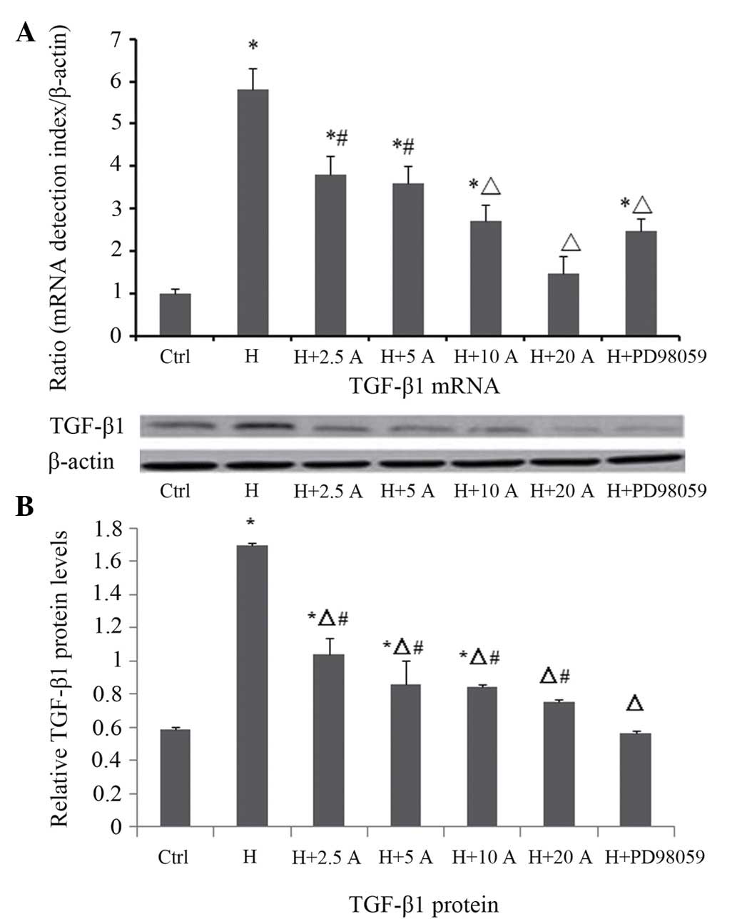The mRNA and protein expression levels of TGF-β1 were measured by RT-qPCR and western blotting, respectively (Fig. 5). RT-qPCR demonstrated that the mRNA expression levels of TGF-β1 were significantly increased at 48 h in the high glucose group, as compared with the control group (P<0.05). Allicin treatment resulted in a dose-dependent decrease in the mRNA expression levels of TGF-β1 at 48 h; in particular the differences were significant at 10 and 20 µg/ml allicin (P<0.05 vs. the high glucose group). Upon intervention with PD98059, the mRNA expression levels of TGF-β1 were significantly reduced, as compared with the high glucose group (P<0.05), although they were increased, as compared with the normal control cells (P<0.05). These results were consistent with the results of the western blot analysis. The protein expression levels of TGF-β1 were significantly increased and peaked at 48 h in the high glucose group, as compared with the control group (P<0.05). Allicin decreased the protein expression levels of TGF-β1 at 48 h in a dose-dependent manner, in particular at 20 µg/ml where the inhibition rate was 55.7%, as compared with the high glucose group (P<0.05). Upon intervention with PD98059, the protein expression levels of TGF-β1 were also significantly reduced, as compared with the high glucose group (P<0.05), and were not significantly different, as compared with the control group (P>0.05).