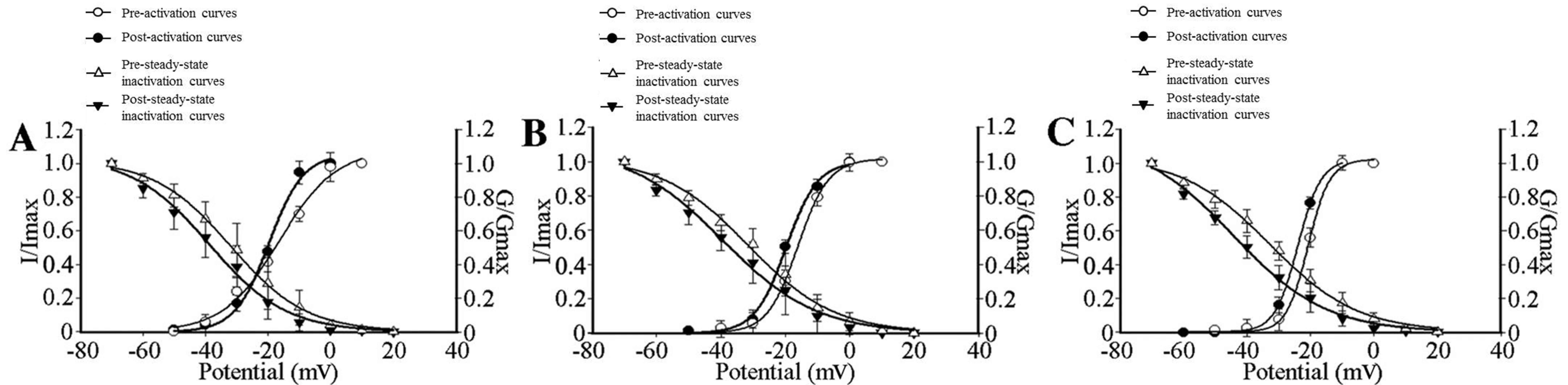 The current density of certain cells was obtained from the inward current standardized by the membrane capacitance and compared with those of other cells. The voltage-dependent current curve was fit according to the Boltzmann equation, G/Gmax=1/{1+exp[(Va1/2-Vm)/Ka]}, where G is the conductance calculated as G=I/(Vm-Vr), where I is the current, Vm is the command voltage, Vr is the reversal potential, Va1/2 is the voltage at the half maximal activation current and Ka is the slope factor describing the voltage dependence of the conductance. The curve of the steady-state inactivation current was fit according to the Boltzmann equation, I/Imax = 1 / {1 + exp [(V - Vi1/2) / Ki]}, where I is the current, V is the pre-stimulus voltage, Vi1/2 is the voltage at the half maximal inactivation current and Ki is the slope factor of inactivation.