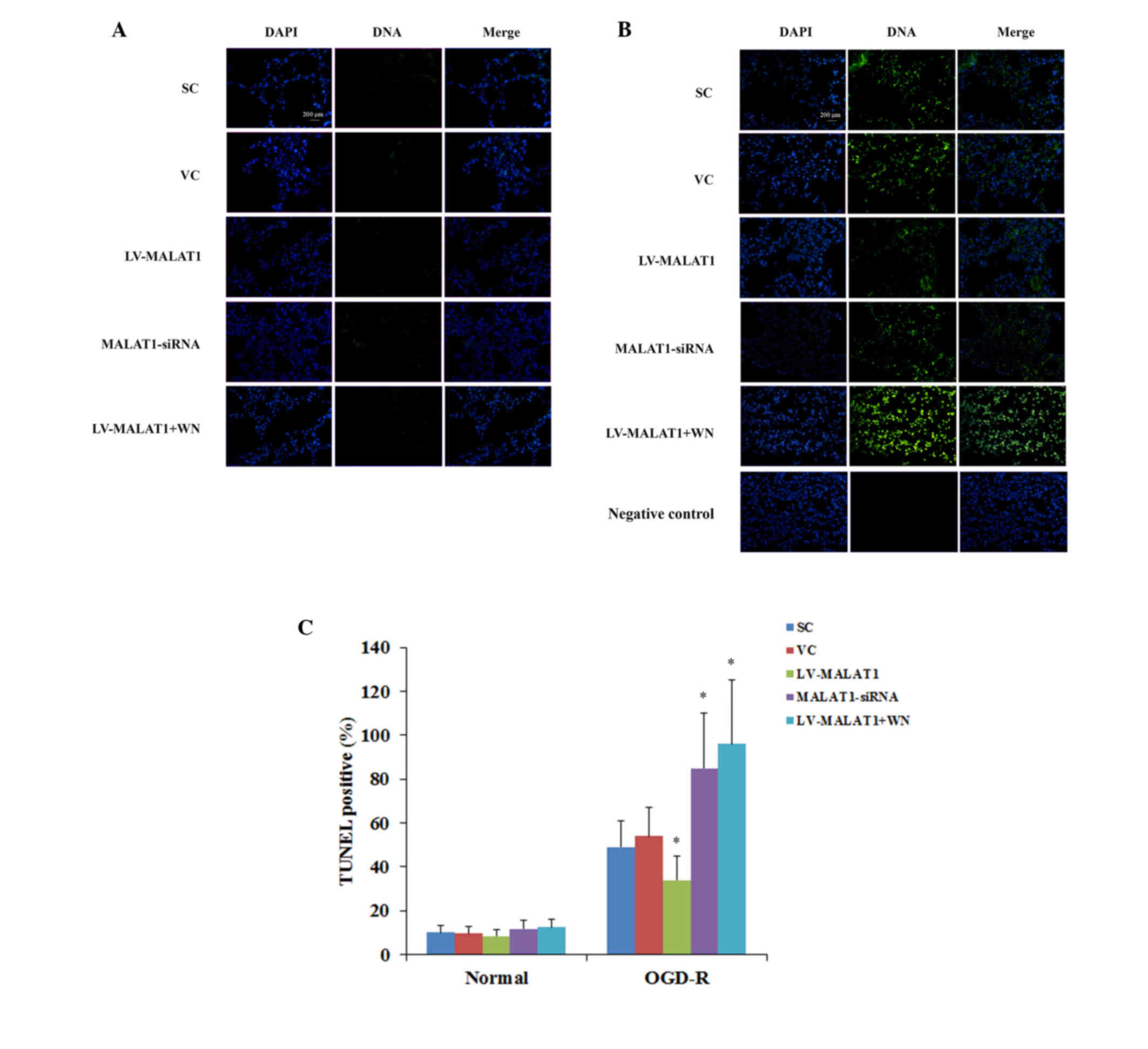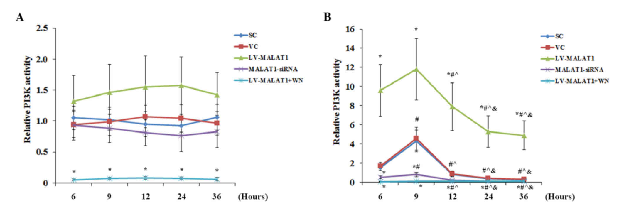 In conclusion, to the best of our knowledge, the present study was the first to indicate that lncRNA MALAT1 protects human brain vascular endothelial cells from OGD-R-induced apoptosis via a PI3K-dependent mechanism, suggesting that MALAT1 may be a potential novel therapeutic target for cerebral I/R injury. Further study is required in order to elucidate the underlying mechanisms.