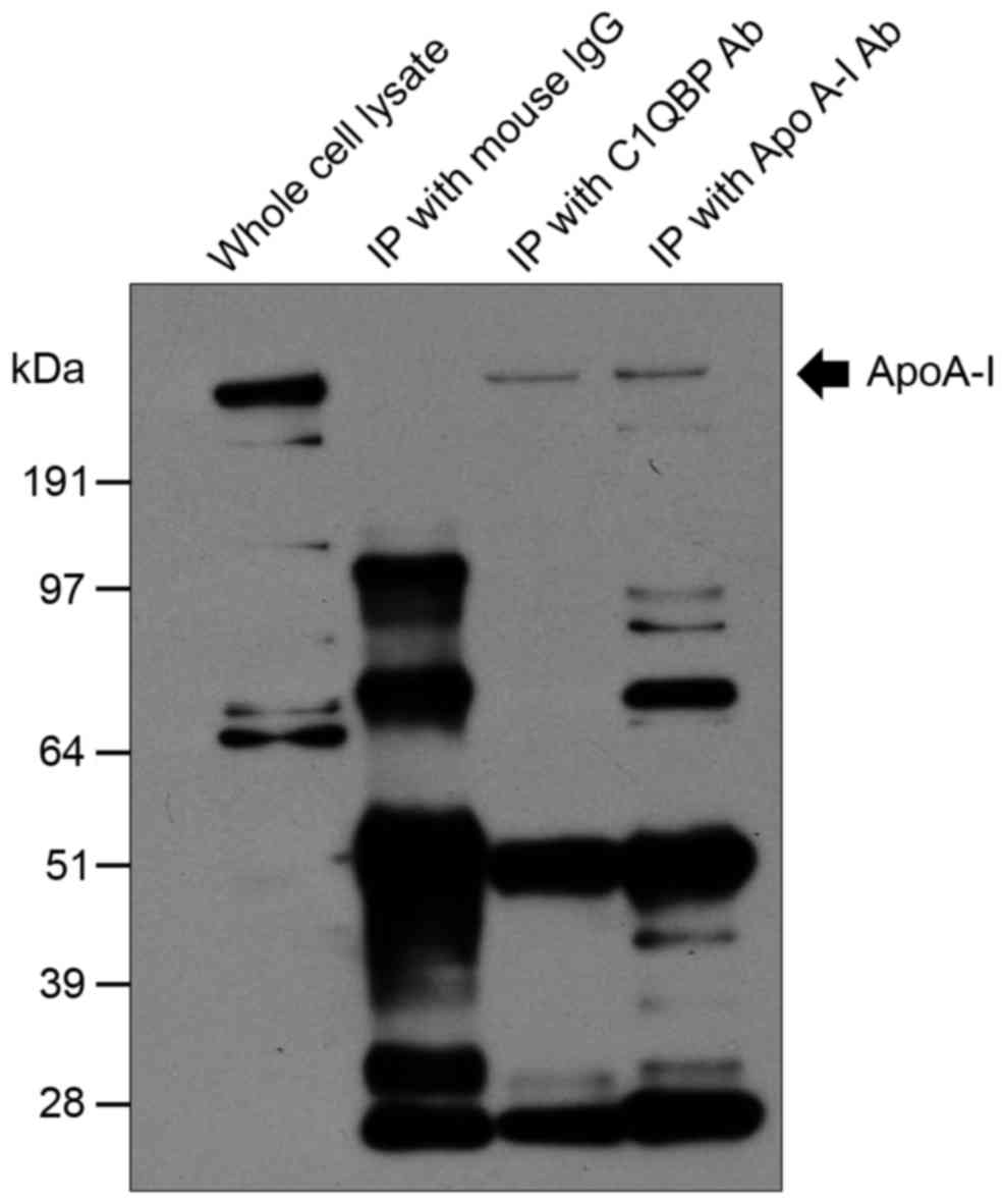 Reverse immunoprecipitation was subsequently used to confirm the interaction between C1QBP and candidate proteins. Among the proteins listed in Table II, ApoA-I was selected for confirmation of its interaction with C1QBP. Human SW620 colon cancer cells were used because they express high levels of C1QBP (Fig. 2B, and mouse IgG or antibodies against C1QBP and ApoA-I were added to SW620 whole-cell lysates. Immunoprecipitation was then performed, followed by western blotting. Immunoreactive signals produced by monoclonal antibodies against ApoA-I were detected in immunoprecipitates prepared using both anti-ApoA-I and -C1QBP antibodies (Fig. 4). In addition, SW620 whole cell lysates were immunoreactive for ApoA-I (Fig. 4).