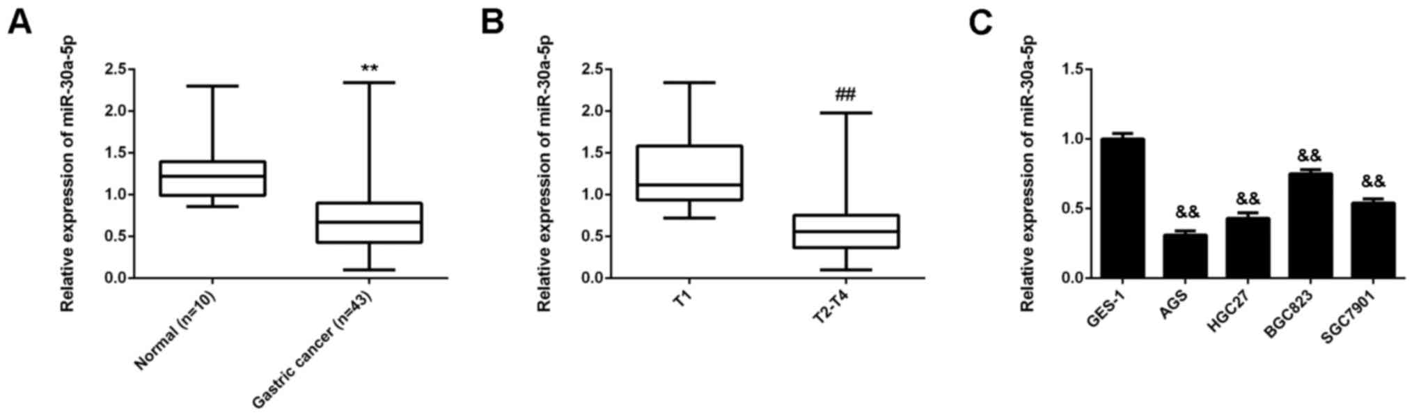 To determine the role of miR-30a-5p in gastric cancer, the levels of miR-30a-5p expression were evaluated in gastric cancer tissues (n=43) and normal gastric tissues (n=10). RT-qPCR data indicated that the expression of miR-30a-5p was significantly decreased in gastric cancer tissues compared with normal gastric tissues (P<0.01; Fig. 1A). In addition, miR-30a-5p expression was significantly lower in T2-T4 stage cancer compared with that in T1 stage cancer (P<0.01), suggesting that decreased levels of miR-30-5p were associated with advanced malignancy (Fig. 1B). The expression of miR-30a-5p in human gastric cancer cell lines was subsequently assessed. Similar to gastric cancer tissues, it was observed that miR-30a-5p was downregulated in the gastric cancer cell lines AGS, HGC27, BGC823 and SGC7901, when compared with the gastric mucosa epithelial cell line GES-1 (P<0.01; Fig. 1C). Thus, miR-30a-5p was downregulated in gastric cancer, suggesting that reduced expression of miR-30a-5p may be involved in the malignant progression of gastric cancer.