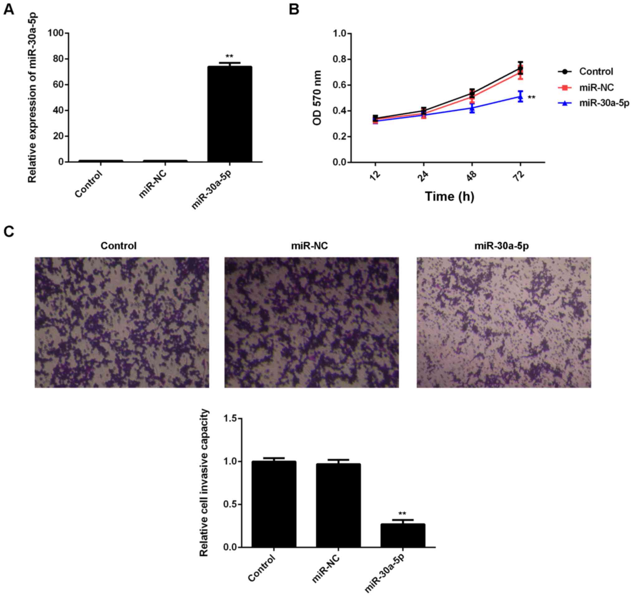 As AGS cells exhibited the lowest levels of miR-30a-5p among the four gastric cancer cell lines, this cell line was used in subsequent experiments. In addition, as miR-30a-5p was downregulated in gastric cancer, miR-30-5p mimic was used to upregulate its levels. Transfection with miR-30-5p mimic significantly increased the expression of miR-30-5p in AGS cells (P<0.01), while transfection with miR-NC had no affect on miR-30-5p expression, relative to the control group (Fig. 2A). An MTT assay was subsequently performed to evaluate cell proliferation, whereby it was observed that overexpression of miR-30a-5p significantly inhibited the proliferation of AGS cells compared with the control group (P<0.01), indicating that miR-30a-5p may serve a suppressive role in the proliferation of gastric cancer cells (Fig. 2B). Moreover, a Transwell assay was conduced to assess the invasive capacities of AGS cells in each transfection group. As depicted in Fig. 2C, transfection with miR-30a-5p mimic significantly decreased the invasion of AGS cells, relative to the control group (P<0.01). Collectively, these data suggest that miR-30a-5p exerts inhibitory effects on the proliferation and invasion of gastric cancer cells.
