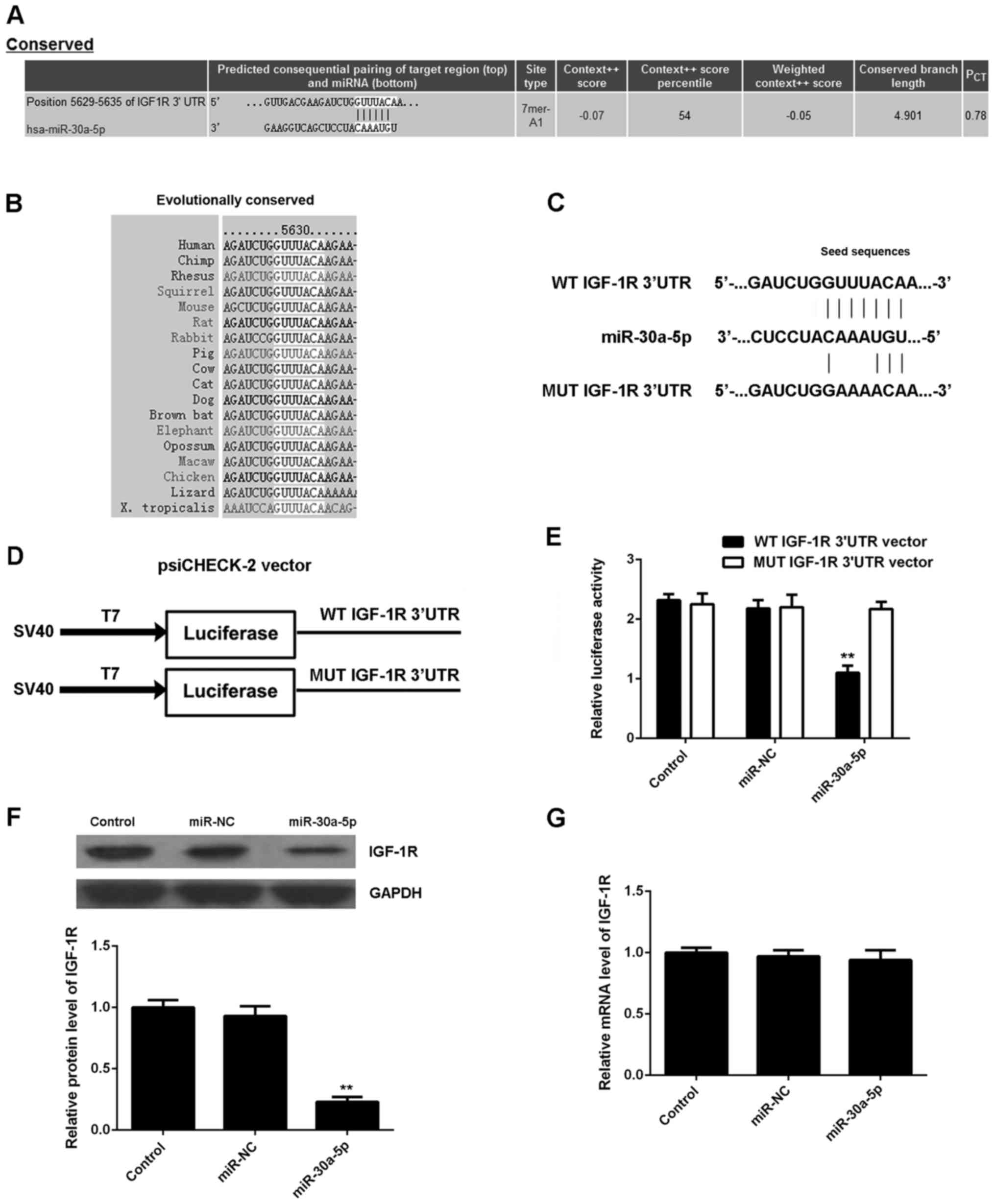 The putative targets of miR-30a-5p were investigated by bioinformatical analysis. TargetScan software predicated that IGF-1R was a potential target of miR-30a-5p (Fig. 3A), and that the targeting relationship between miR-30a-5p and IGF-1R was evolutionally conserved (Fig. 3B). To verify this prediction, reporter vectors containing WT and MUT IGF-1R 3′UTR were generated (Fig. 3C and 3D). A luciferase reporter assay was subsequently conducted, and it was observed that luciferase activity was significantly decreased in AGS cells co-transfected with the WT IGF-1R 3′UTR vector and miR-30a-5p mimic (P<0.01 vs. control; Fig. 3E). However, luciferase activity was unaffected in cells co-transfected with the MUT IGF-1R 3′UTR vector and miR-30a-5p mimic, relative to the control group (Fig. 3E). These data demonstrated that miR-30a-5p may directly bind to the 3′UTR of IGF-1R mRNA. As miRs negatively mediate the expression of their target genes, the effects of miR-30a-5p on the expression of IGF-1R in AGS cells were subsequently investigated. Data from western blot analysis indicated that overexpression of miR-30-5p significantly decreased the protein expression of IGF-1R in AGS cells compared with the control group (P<0.01; Fig. 3F); however, upregulation of miR-30-5p had no affect on the mRNA expression of IGF-1R in AGS cells (Fig. 3G), indicating that miR-30a-5p suppressed the expression of IGF-1R at the post-transcriptional level. Collectively, these findings indicated that miR-30a-5p negatively mediated the protein expression of IGF-1R in AGS cells by directly binding to the 3′UTR of IGF-1R mRNA.