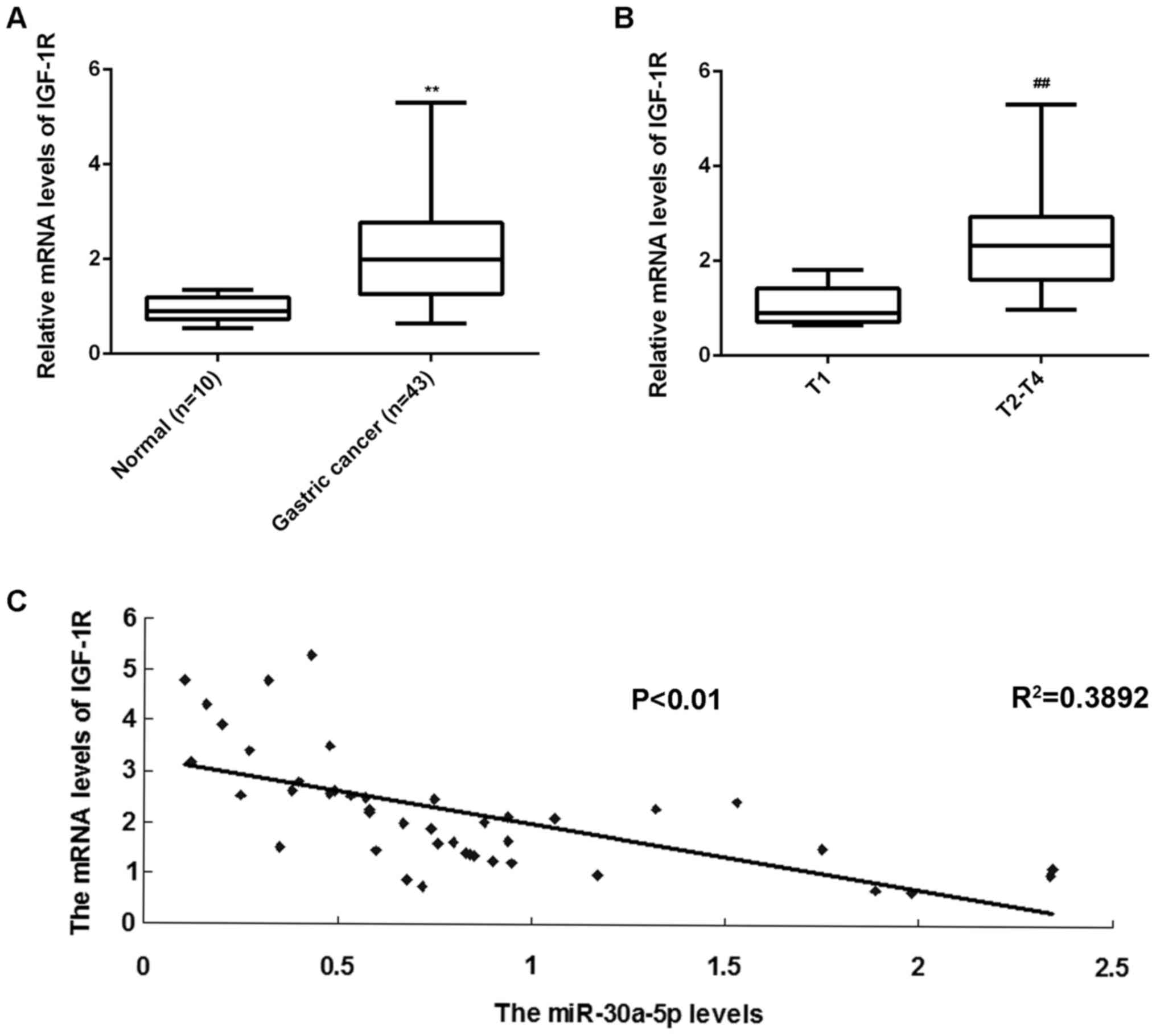 RT-qPCR was performed to measure the expression of IGF-1R in gastric cancer tissues and normal gastric tissues. Results indicated that levels of IGF-1R mRNA were significantly upregulated in gastric cancer tissues compared with normal gastric tissues (P<0.01; Fig. 5A). Furthermore, IGF-1R mRNA was significantly increased in T2-T4 stage cancer compared with T1 stage cancer (P<0.01; Fig. 5B), suggesting that its upregulation may be involved in the malignant progression of gastric cancer. In addition, an inverse correlation between the expressions of miR-30a-5p and IGF-1R was identified in gastric cancer tissues (R2=0.3892, P<0.01; Fig. 5C). Therefore, increased levels of IGF-1R in gastric cancer may be attributed to a downregulation in miR-30a-5p.