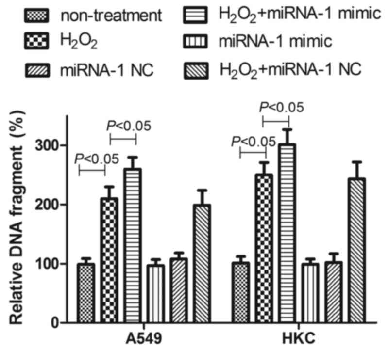 Transfected A549 cells and HKC cells were treated with 100 µM H2O2, after 48 h. The number of DNA fragments of apoptotic cells was detected by a cell death detection ELISA kit.