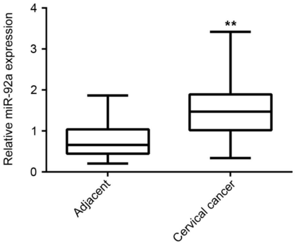 In the present study, the expression, clinical significance and regulatory mechanism of miR-92a in cervical cancer was explored. Reverse transcription-quantitative polymerase chain reaction (RT-qPCR) and western blotting were used to evaluate mRNA and protein expression. MTT and wound healing assays were used to determine the cell viability and migration. A luciferase reporter gene assay was used to confirm the targeting relationship.