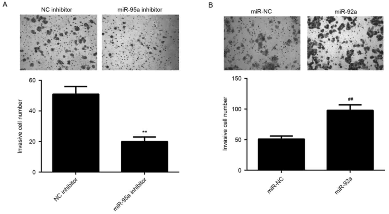 The regulatory role of miR-92a in cervical cancer cell viability and invasion was further studied. Cervical cancer HeLa cells were transfected with miR-92a inhibitor or mimic, and NC inhibitor and miR-NC were used as control groups, respectively. After transfection, RT-qPCR was conducted to examine the miR-92a expression levels. As demonstrated in Fig. 2A and B, transfection with miR-92a inhibitor significantly decreased the miR-92a expression level compared with the NC inhibitor group, whereas transfection with miR-92a mimic led to a significant increase in miR-92a expression level compared with the miR-NC group (both P<0.01). MTT assay was then used to examine cell viability. As demonstrated in Fig. 2C and D, knockdown of miR-92a significantly reduced HeLa cell viability, whereas overexpression of miR-92a significantly enhanced HeLa cell viability (P<0.01). Similar findings were also observed in the invasion assay, which indicated that miR-92a inhibition significantly reduced HeLa cell invasion, whereas its upregulation significantly promoted HeLa cell invasion (P<0.01; Fig. 3A and B). Based on these data, the present results demonstrated that miR-92a promotes HeLa cell viability and invasion.